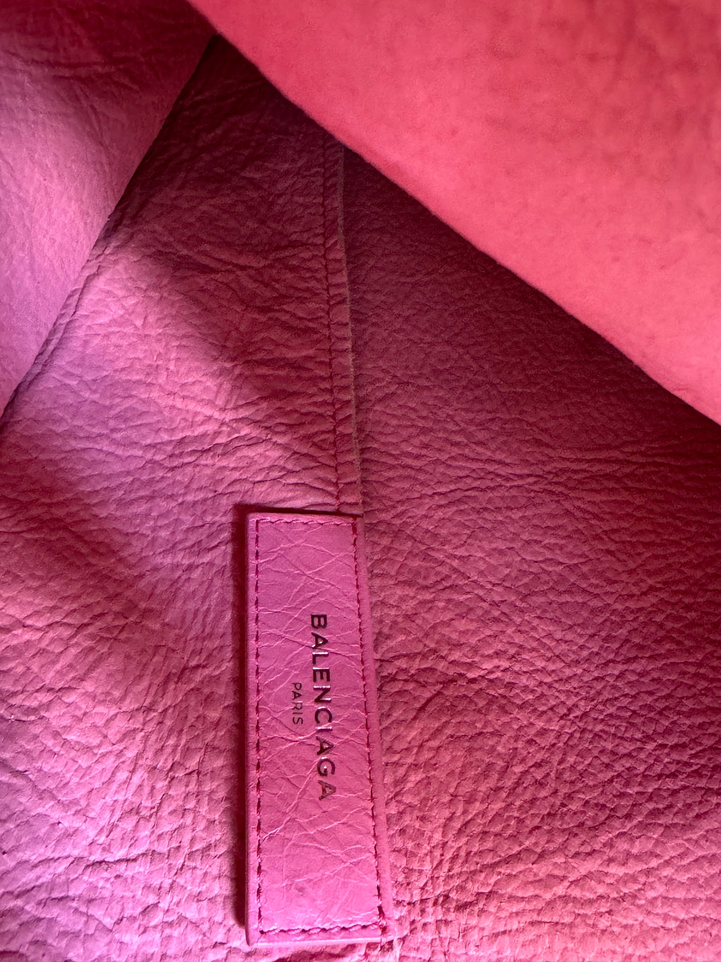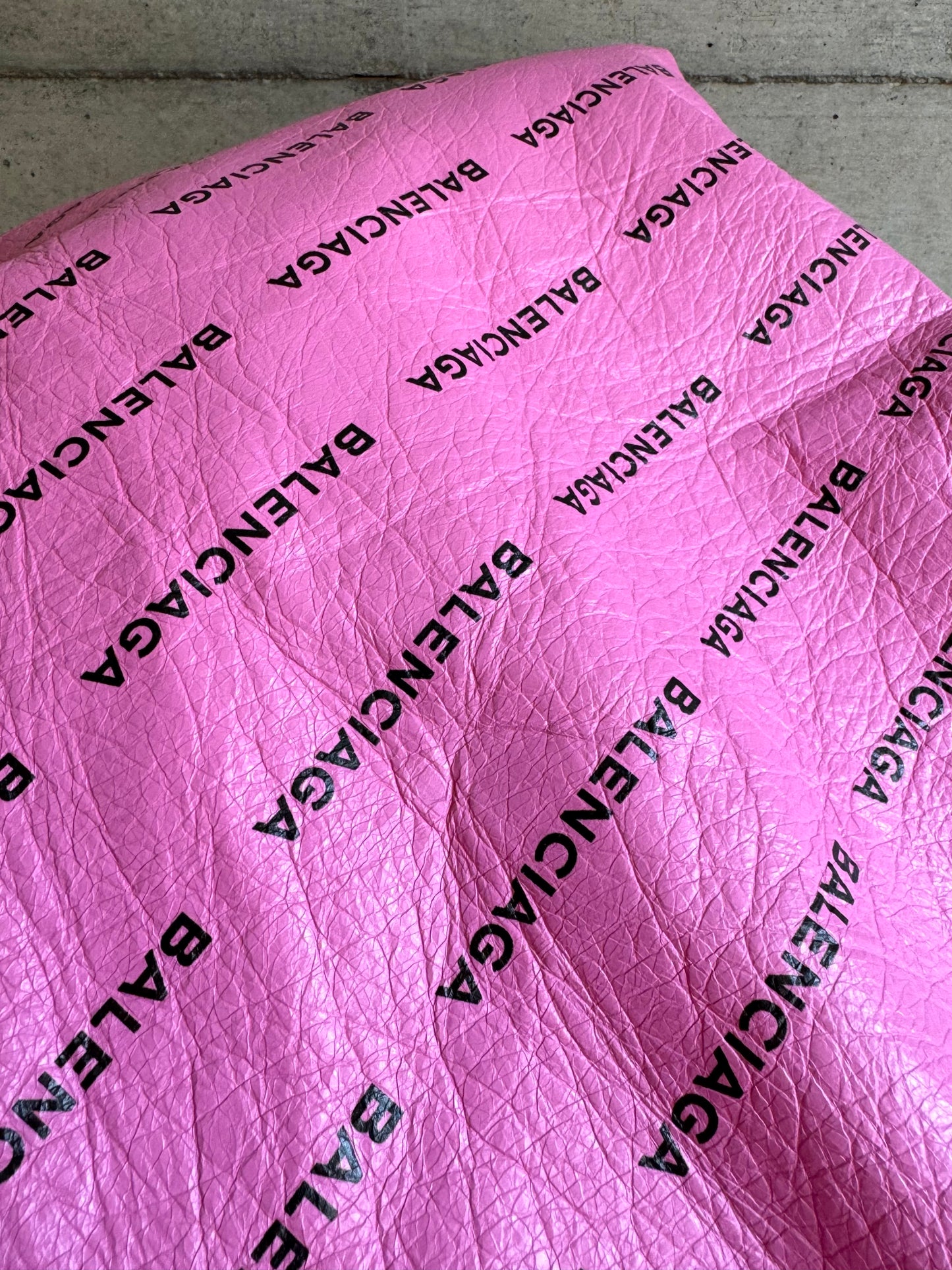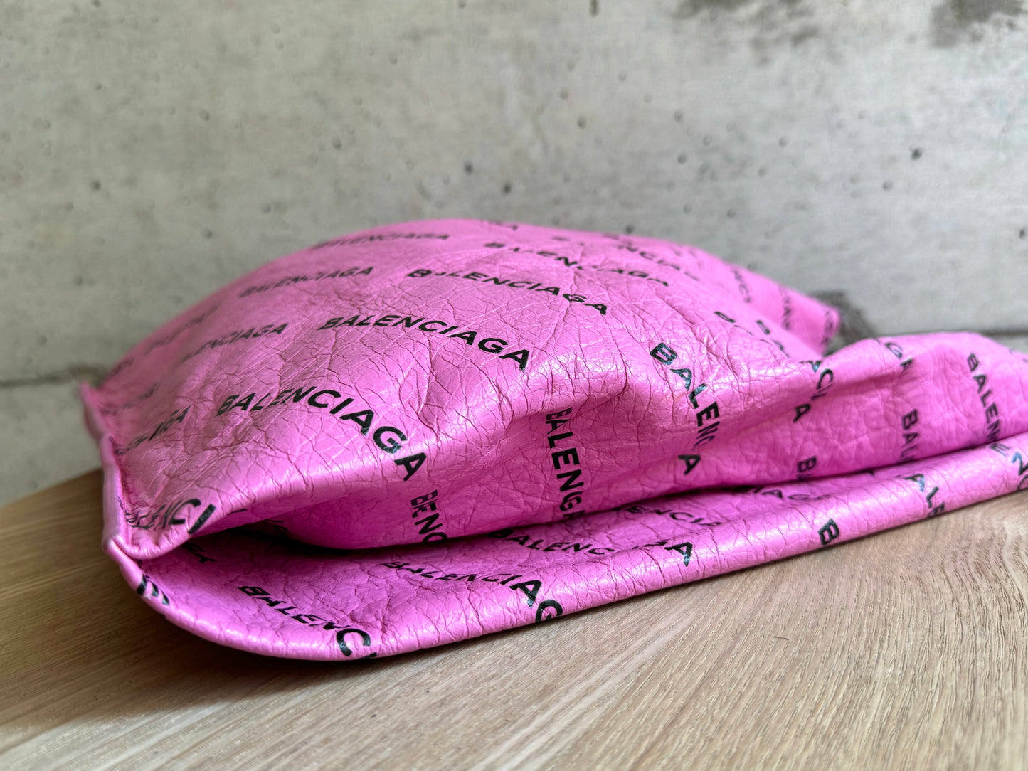 Description: This is a genuine BALENCIAGA Agneau Arena Allover Logo M Supermarket Shopper in Rose Bonbon and Black. This chic tote is made of luxuriously soft calfskin leather in pink. The bag features black Balenciaga lettering and leather handles, opening to a pink leather interior.