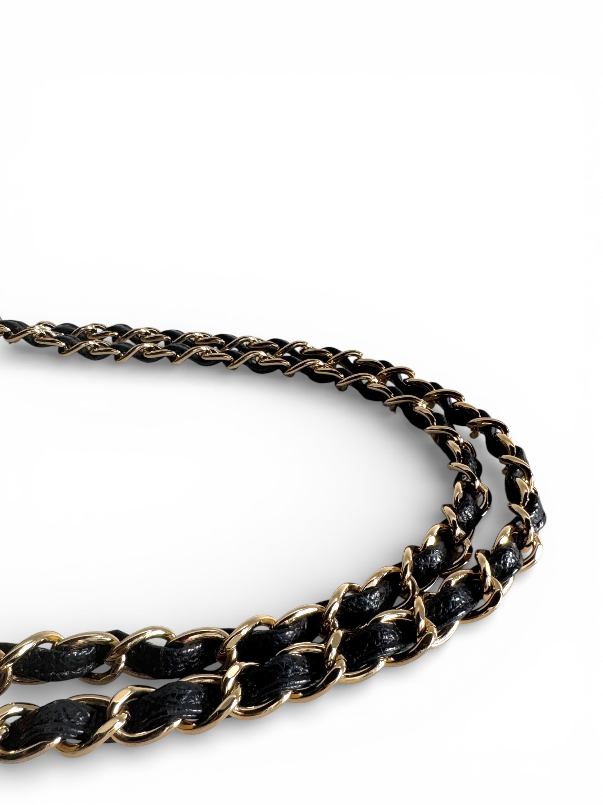 Expertly made from premium grained caviar calfskin with its signature diamond-quilted pattern, this elegant shoulder bag boasts interwoven chain-link straps in polished gold-tone metal threaded with leather for comfort and style. It includes a practical exterior back slip pocket and a front flap secured by the iconic CC turnlock closure.