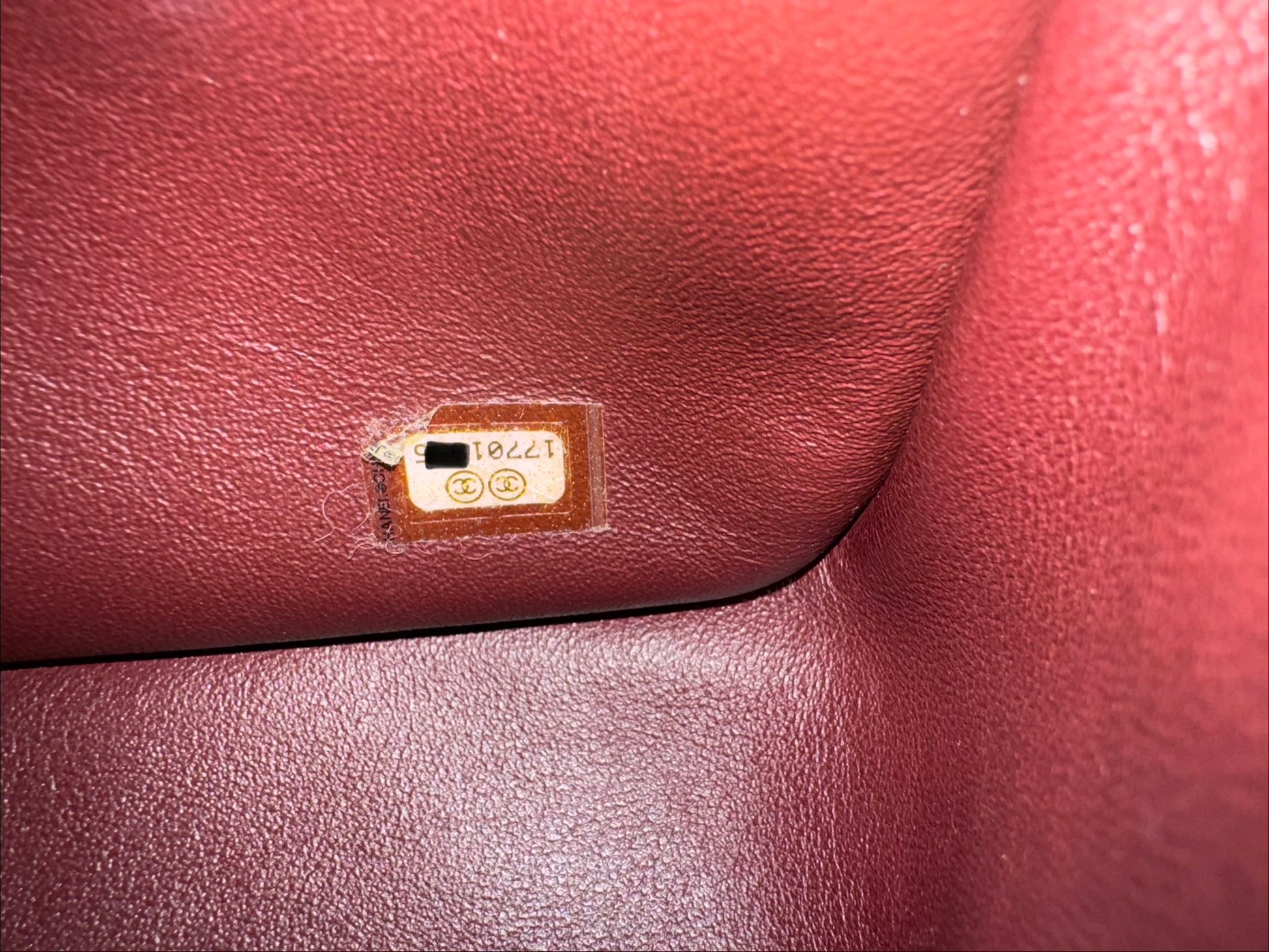 Opening the front flap reveals a secondary inner flap and a rich bordeaux (burgundy) leather lining, complete with multiple interior patch pockets for organization.