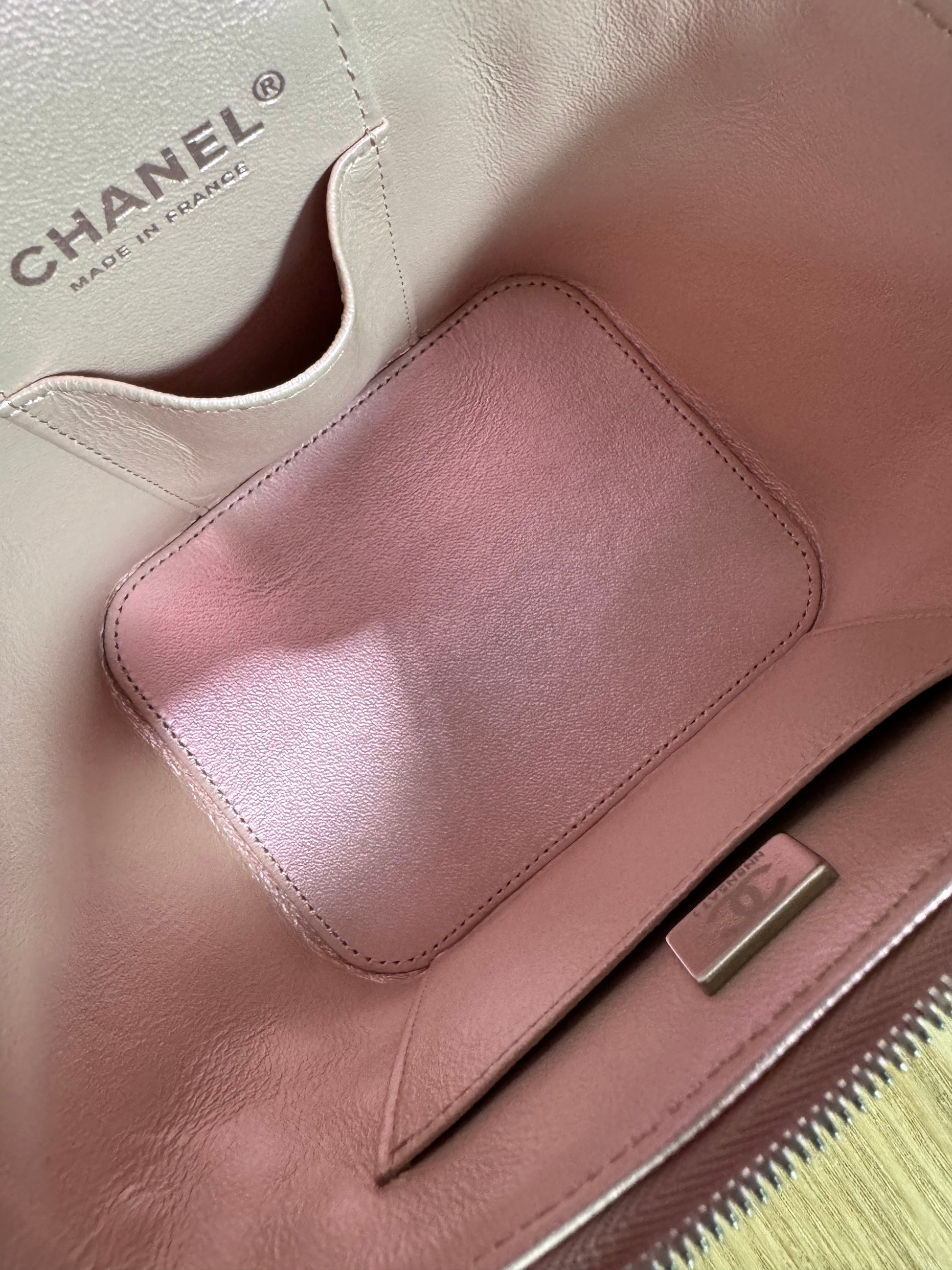 Description: This is a genuine CHANEL Iridescent Calfskin Quilted Small Top Handle Vanity Case with Chain in Pink. This stylish shoulder bag is expertly crafted from luxurious grained light pink calfskin leather. It features a leather-threaded matte gold-tone chain shoulder strap, a top handle, and a Chanel CC logo on the front. The top zippers open to a matching leather interior with patch pockets and a mirror.