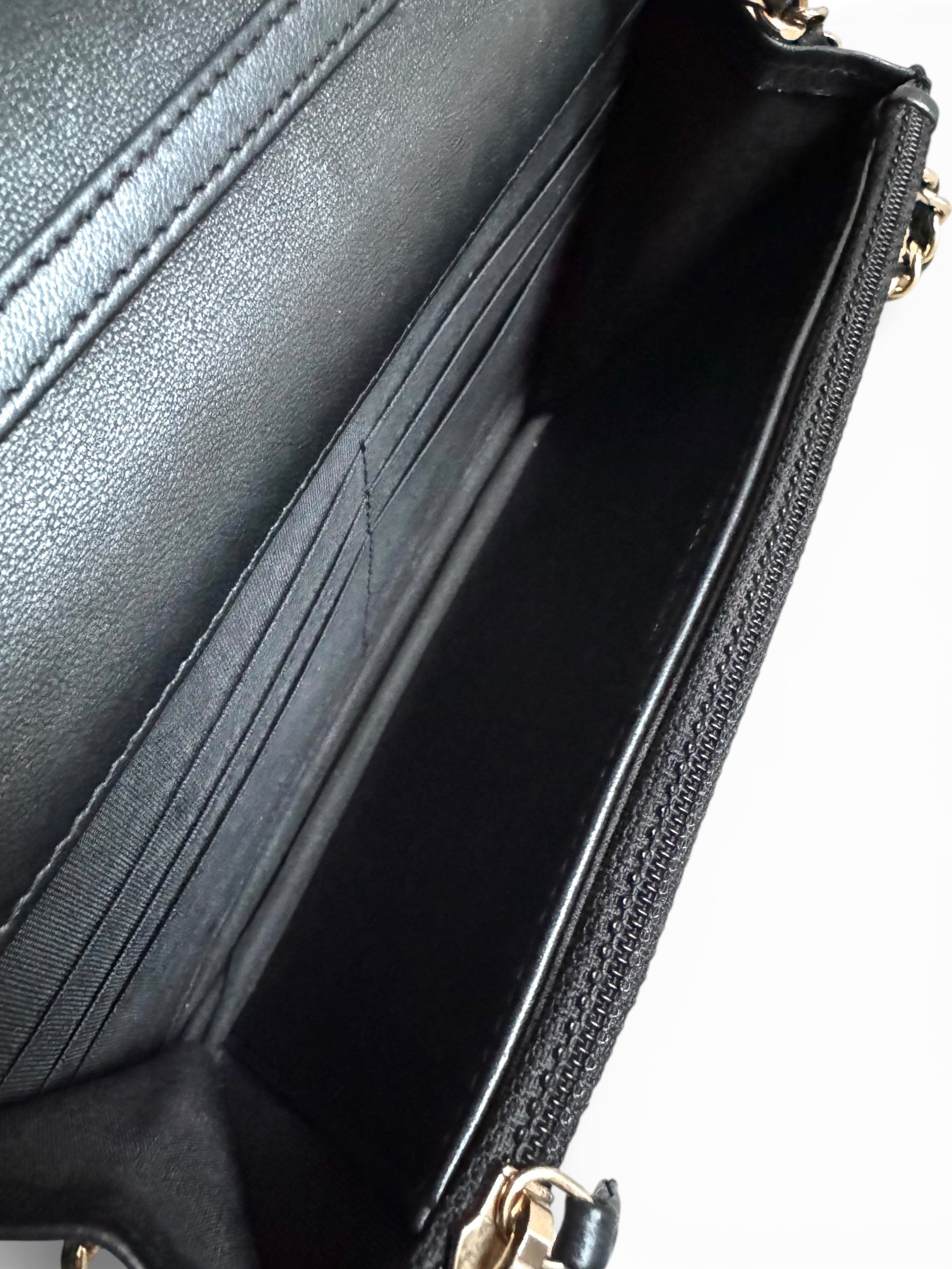 Description: From the Fall 2018 Collection. Black quilted lambskin Chanel Pearl Wallet On Chain with gold-tone hardware, pearl-accented chain-link and leather shoulder strap, CC logo adornment at front flap, single zip pocket at flap underside, three interior compartments; one with zip closure, tonal leather and grosgrain interior lining, six card slots and magnetic snap closure at front flap.