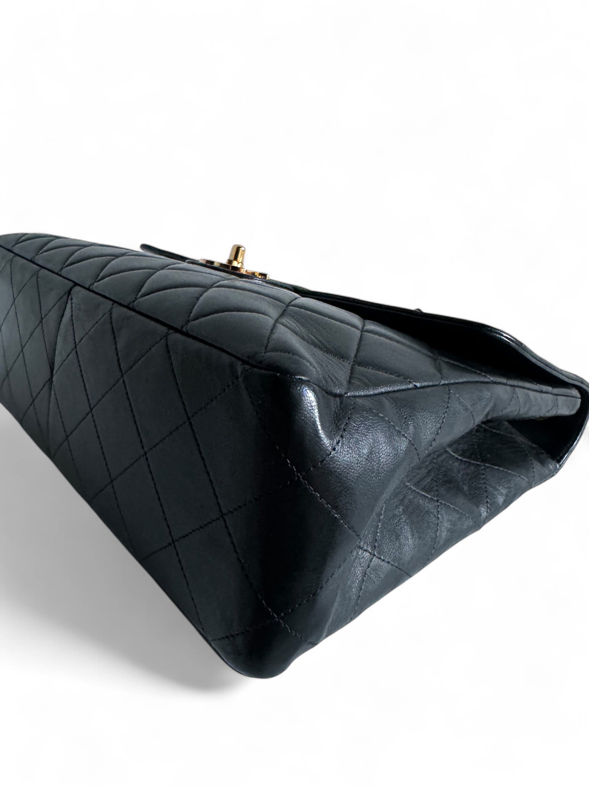 Description: This is a genuine CHANEL Jumbo Single Flap bag in black quilted lambskin. Crafted from soft, diamond-quilted leather, this elegant shoulder bag features a polished gold chain-link strap interwoven with leather, a back slip pocket, and the iconic gold CC turn-lock on the front flap. Opening the flap reveals a black leather interior, complete with both a patch pocket and a zippered pocket for added organization.