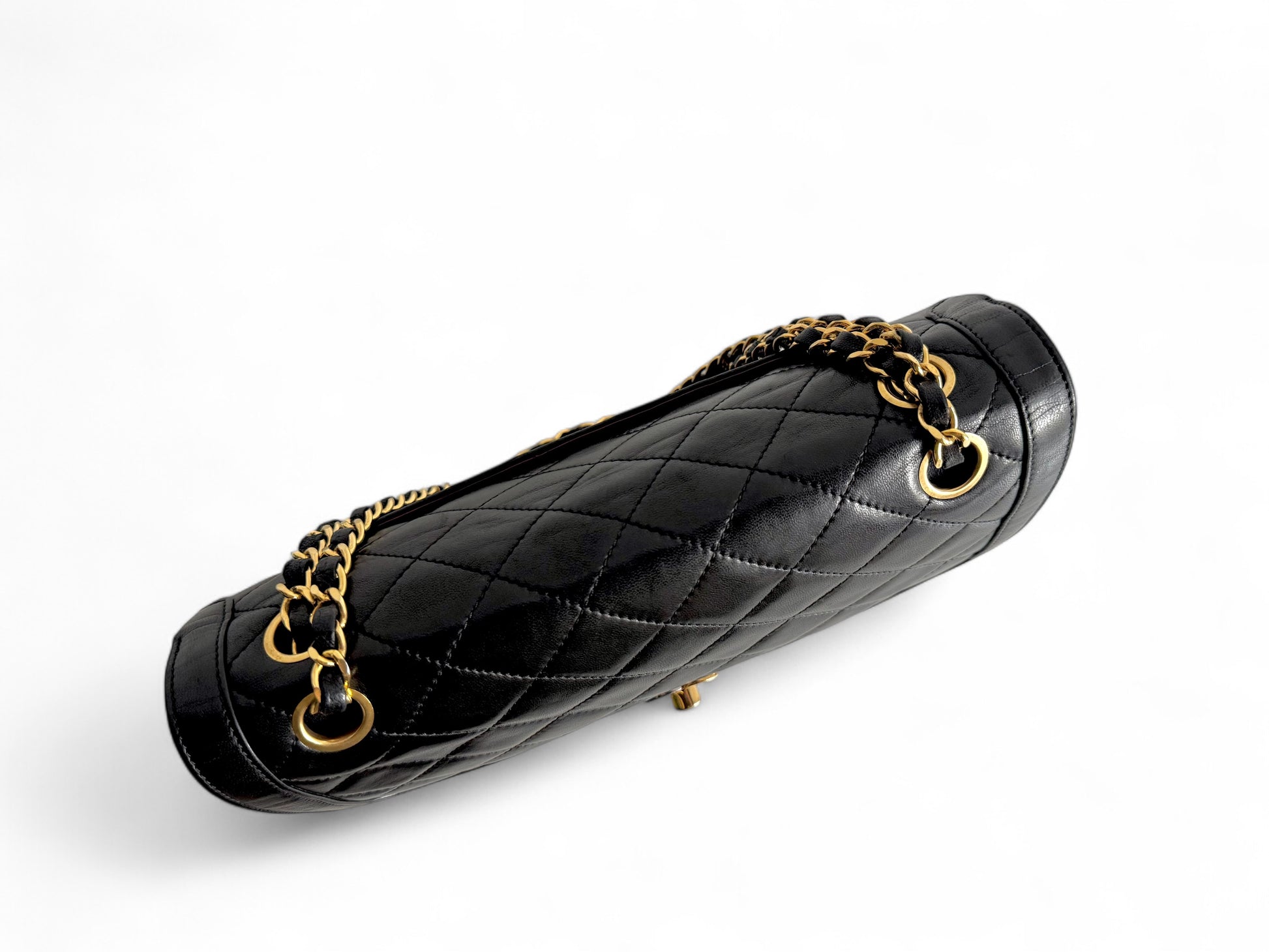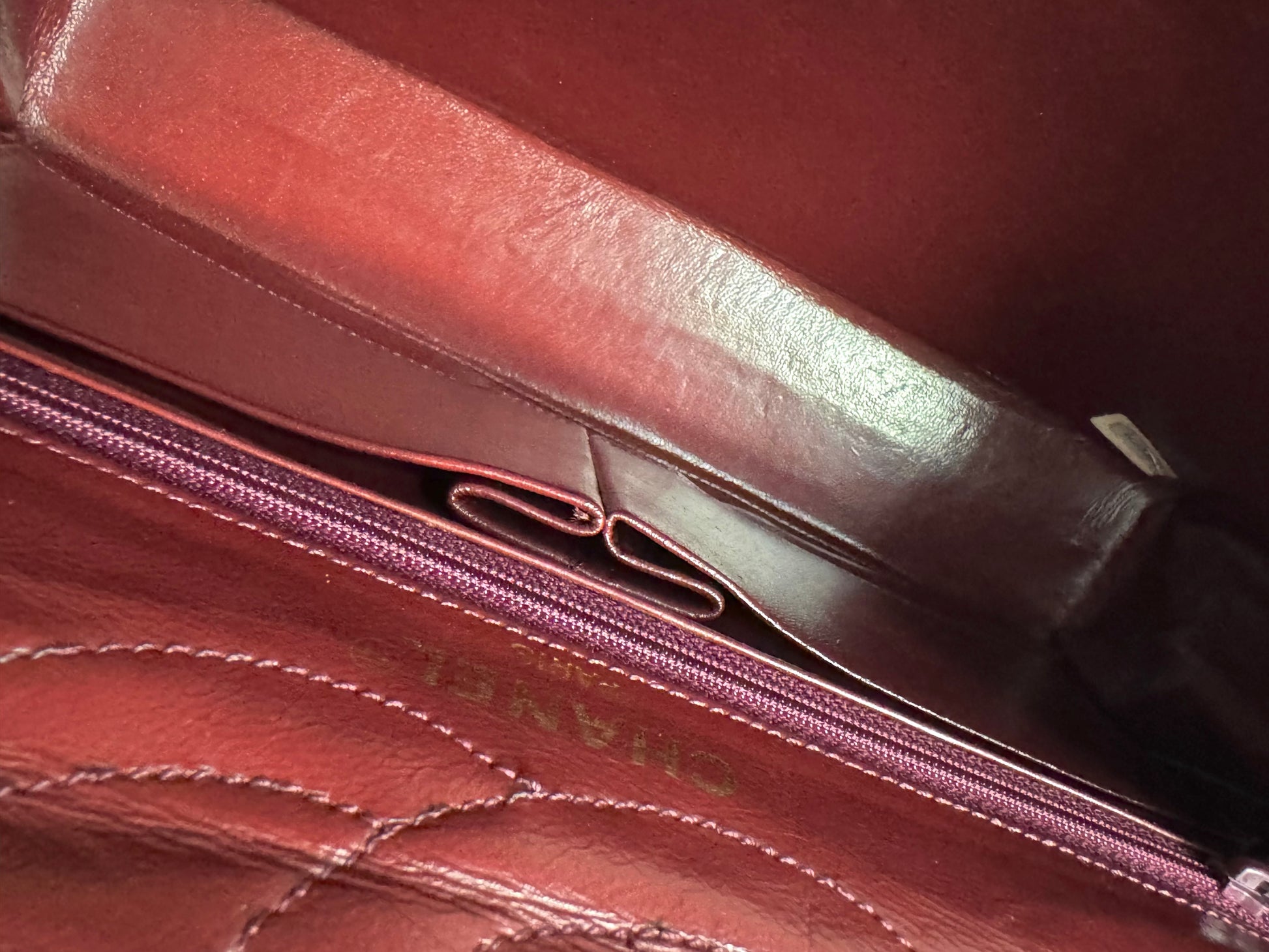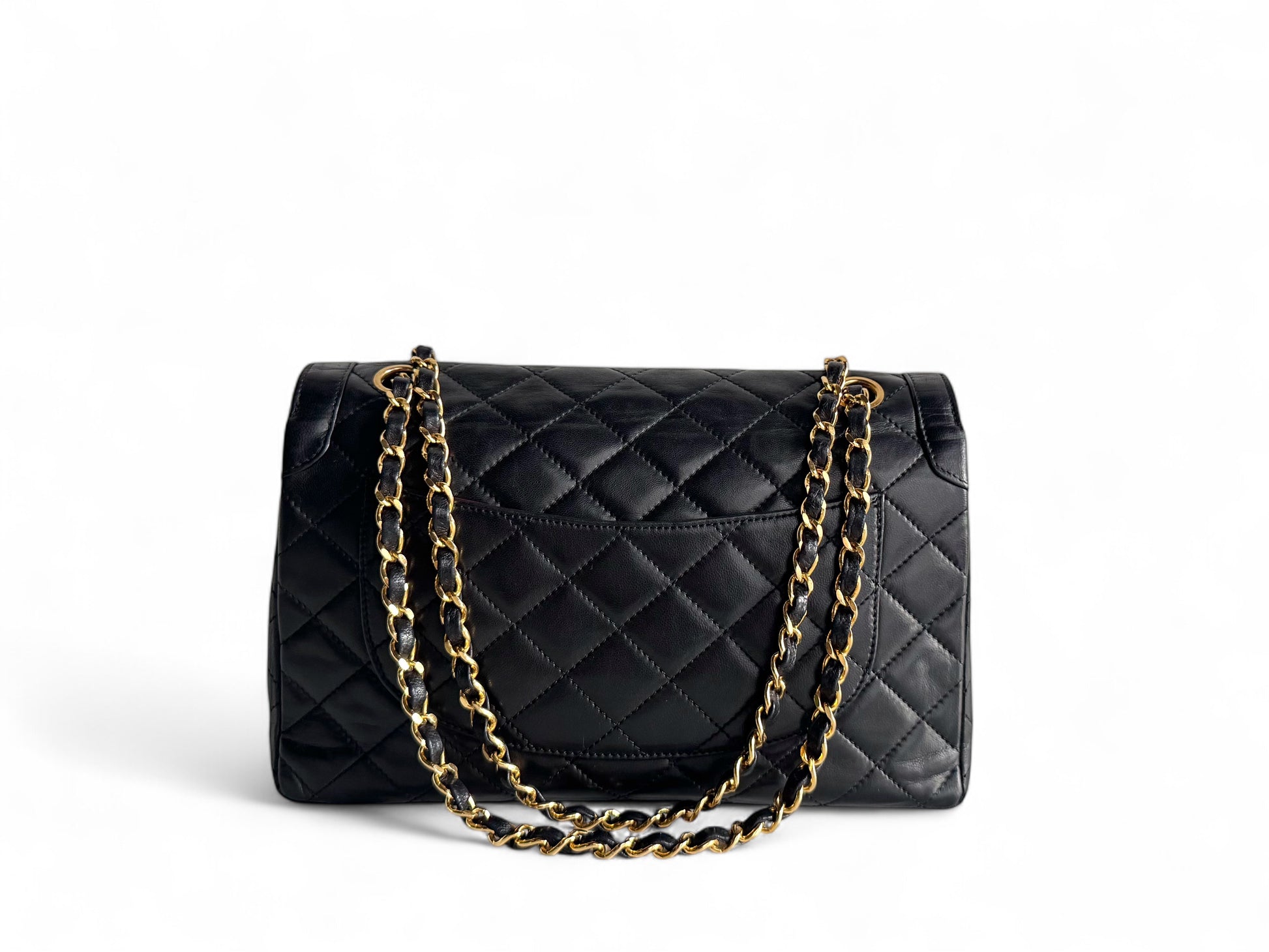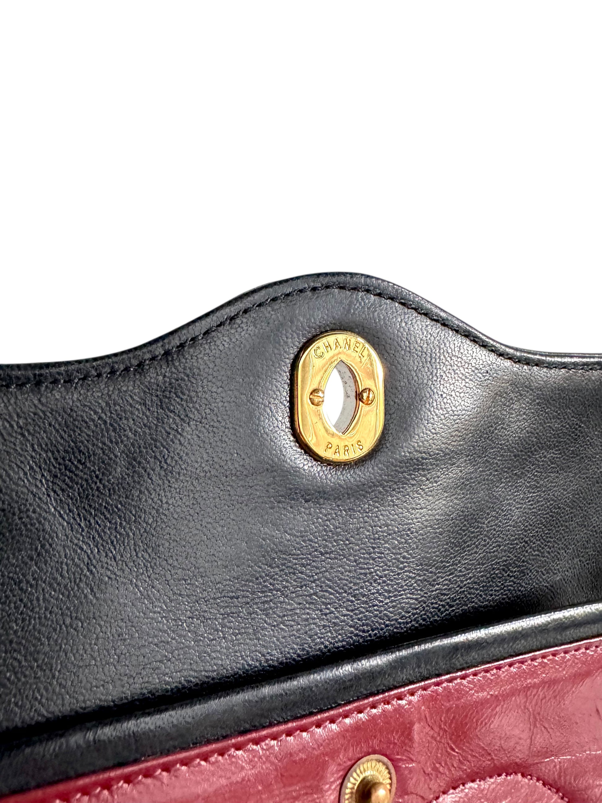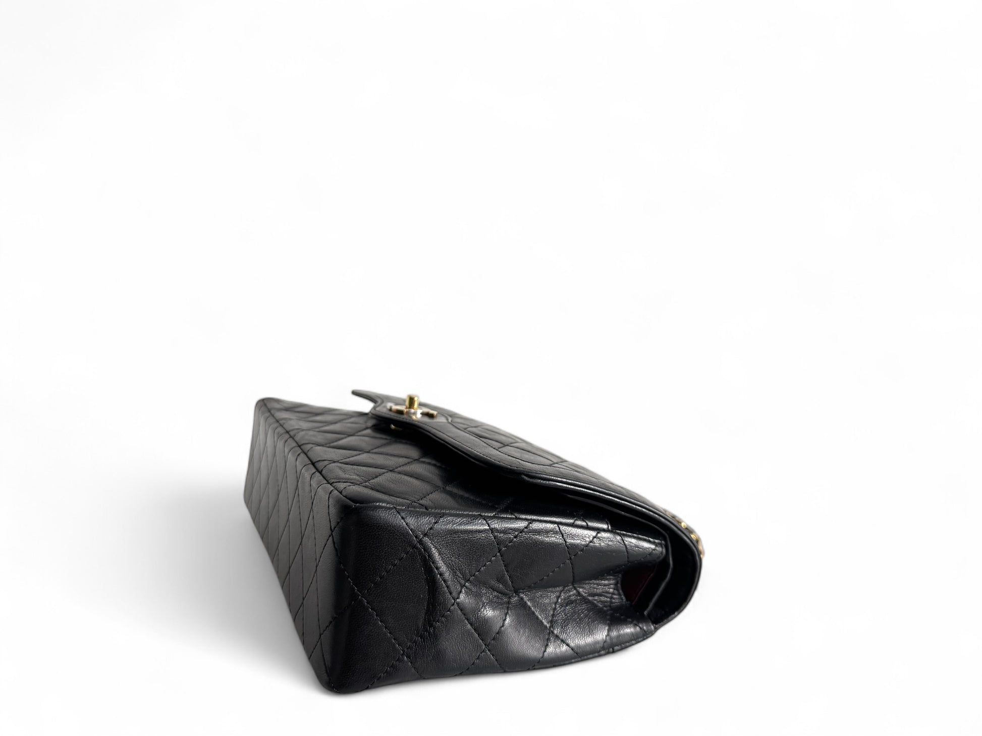 Description: This genuine CHANEL Medium Double Flap bag is made from luxurious black lambskin leather, featuring an elegant diamond quilted design. The bag is adorned with a gold chain-link shoulder strap intertwined with leather, and it has a gold and silver Chanel CC turn-lock closure on the front flap. Inside, you’ll find an additional flap and a rich burgundy leather lining that includes patch pockets and a zippered pocket for storage.