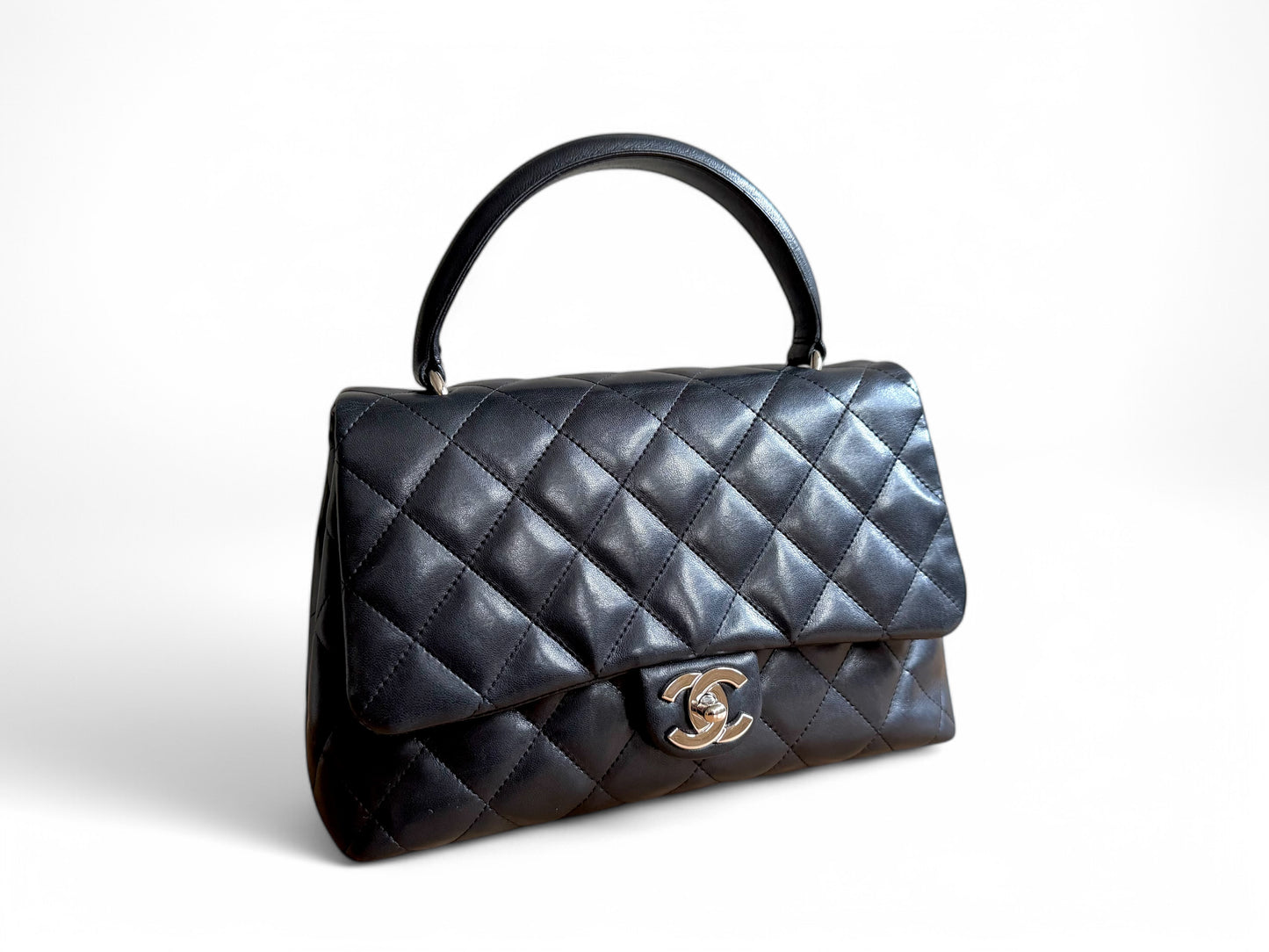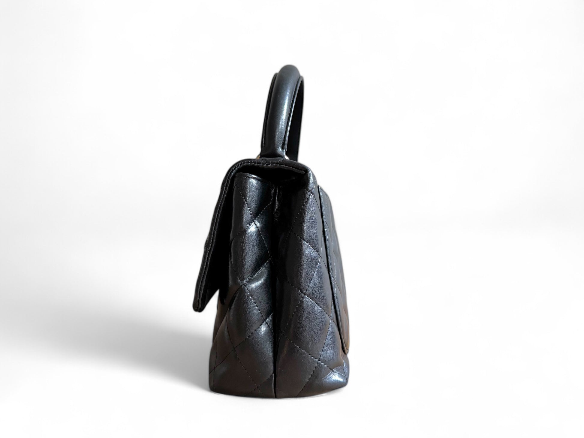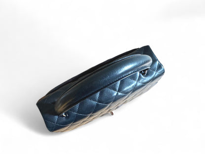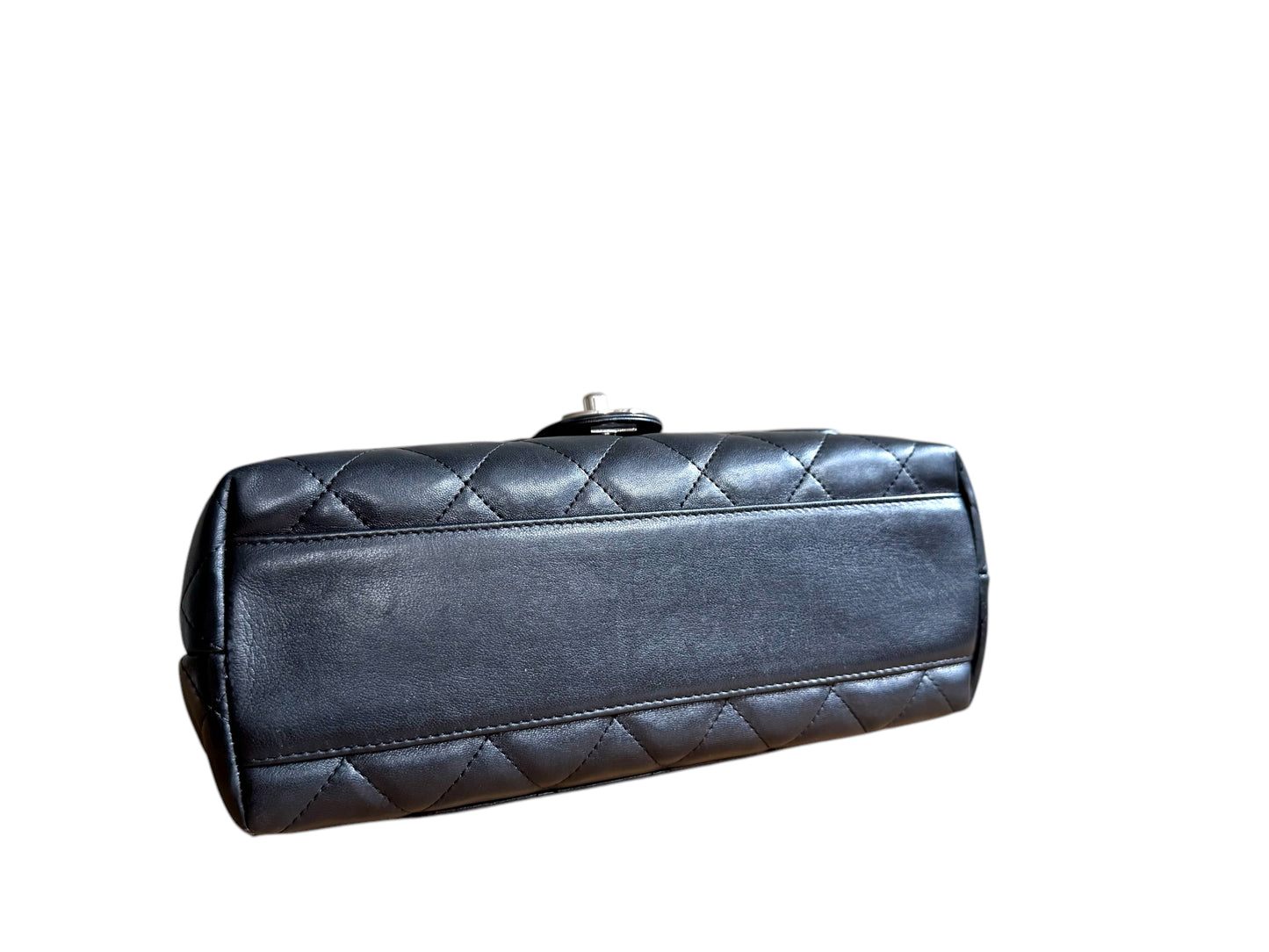 Description: This is a genuine CHANEL Medium Kelly Flap Bag crafted from luxurious black lambskin leather with a diamond-quilted design. This elegant vintage piece features a durable leather top handle, silver-tone hardware, and a signature Chanel CC turn-lock closure. The flap opens to reveal a bordeaux-colored smooth leather interior, complete with a zippered pocket and patch compartments for added functionality.