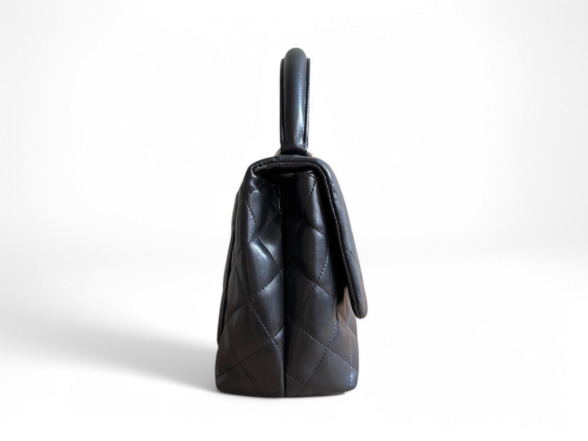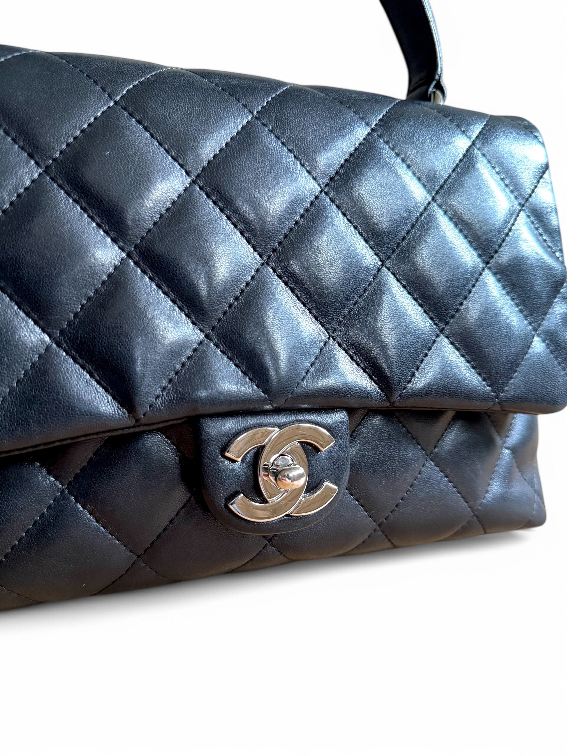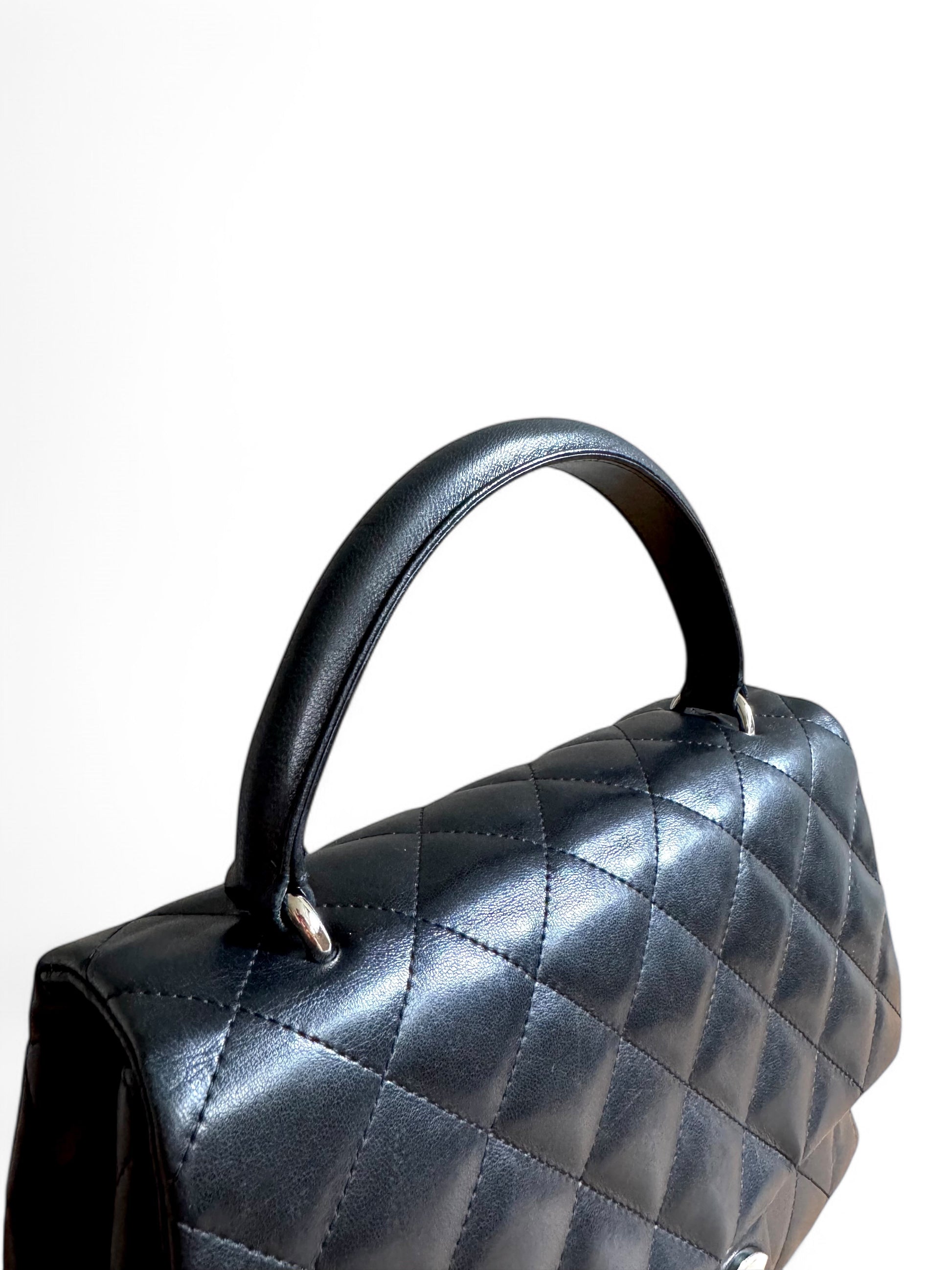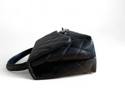 Description: This is a genuine CHANEL Medium Kelly Flap Bag crafted from luxurious black lambskin leather with a diamond-quilted design. This elegant vintage piece features a durable leather top handle, silver-tone hardware, and a signature Chanel CC turn-lock closure. The flap opens to reveal a bordeaux-colored smooth leather interior, complete with a zippered pocket and patch compartments for added functionality.