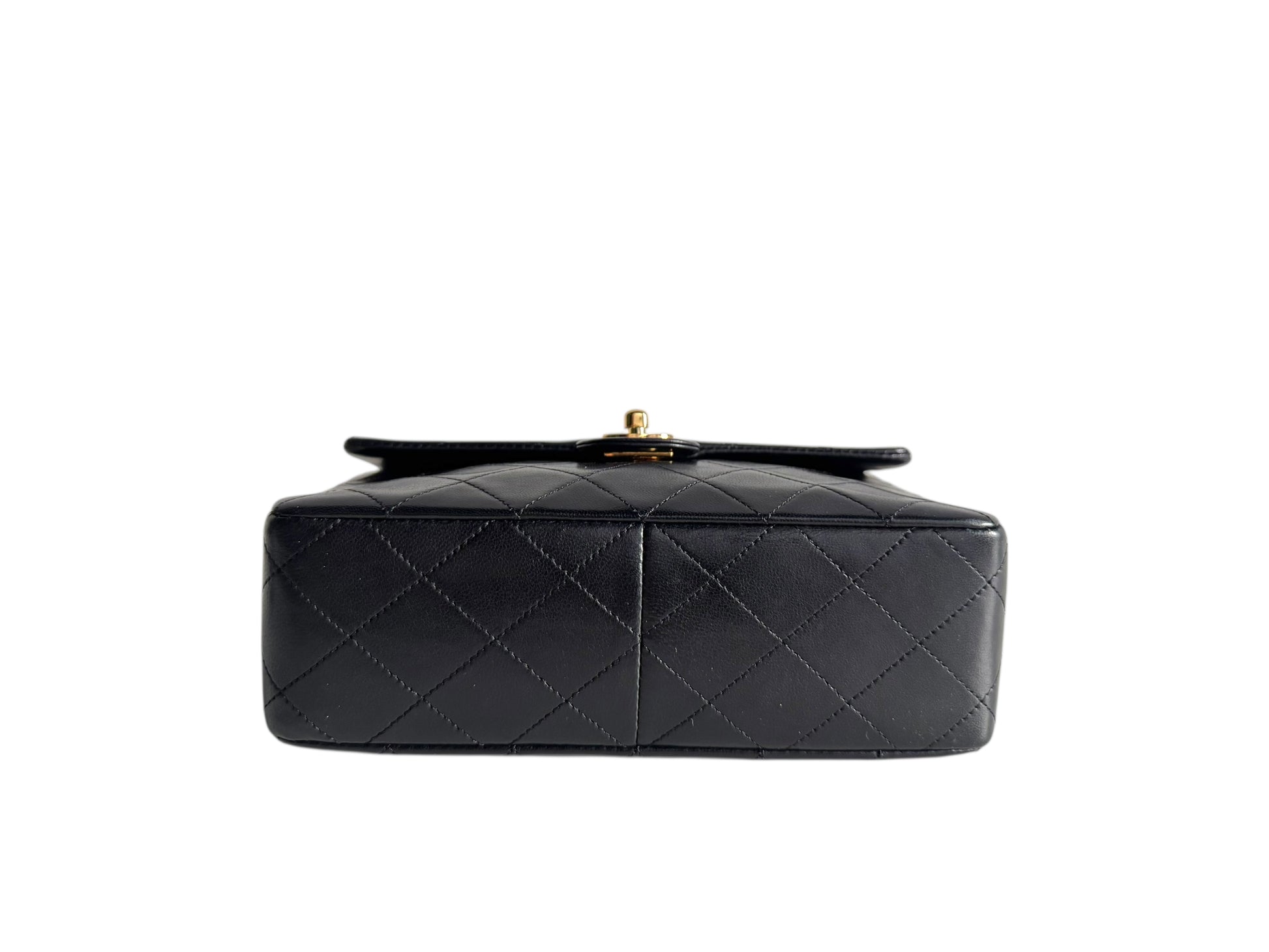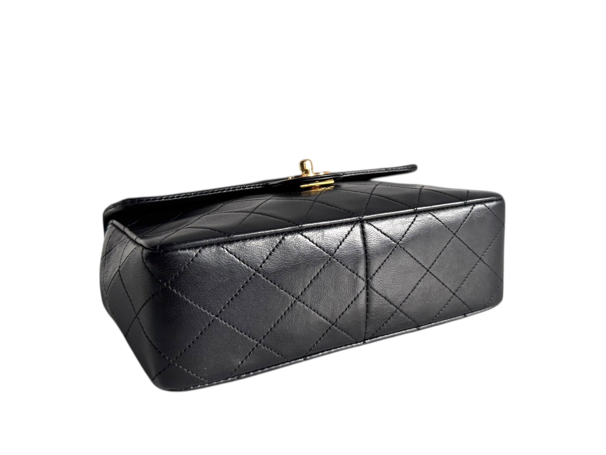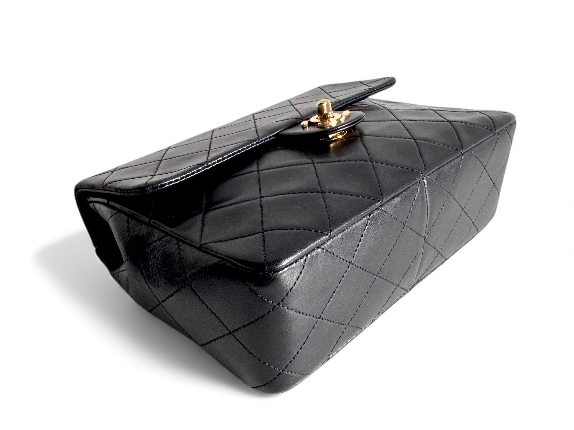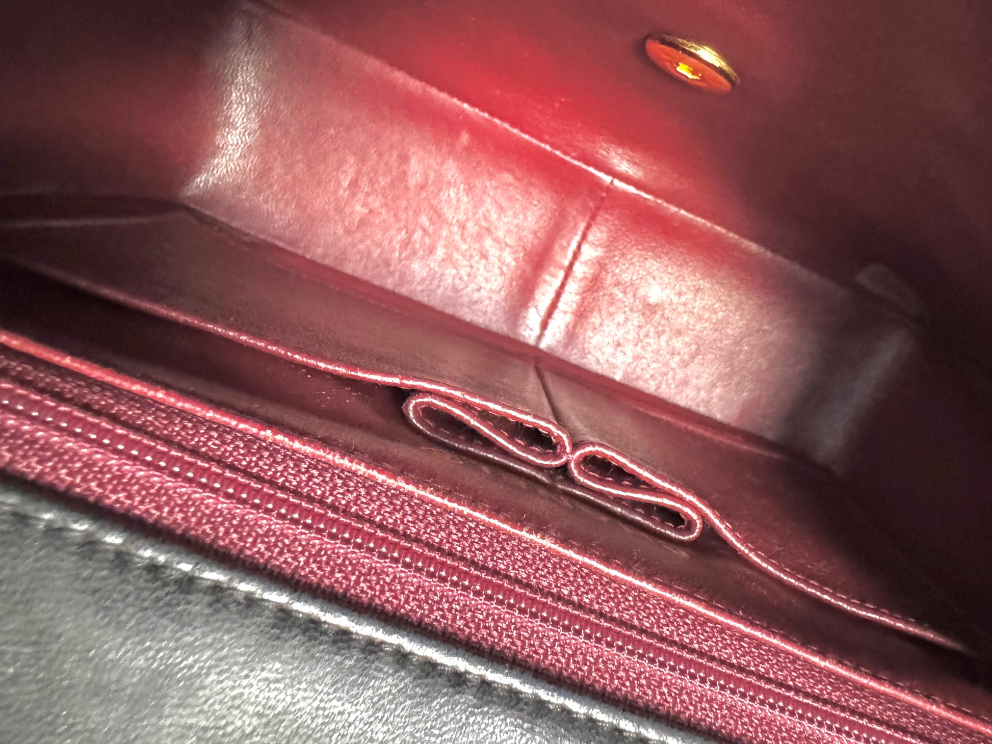 Description: This is an authentic CHANEL Small Single Flap Bag crafted from luxurious black lambskin leather with the signature diamond quilting. Known as the highly sought-after classic model, it features a classic gold-tone chain strap interwoven with black leather, and a gold-plated CC logo clasp on the front flap. The flap opens to reveal a rich burgundy leather interior, complete with a zippered pocket and an additional slip pocket for essentials.