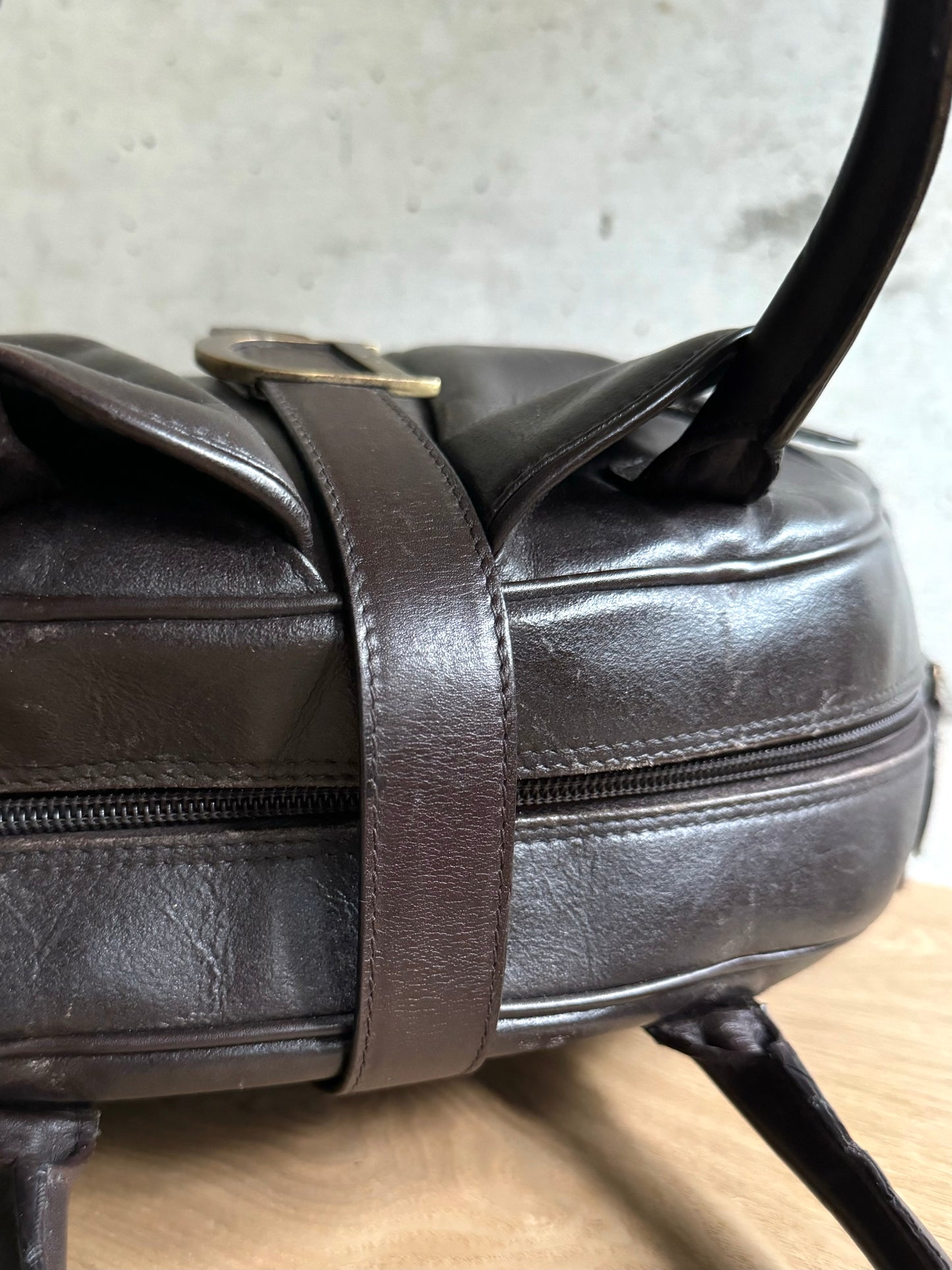 Description: This is a genuine CHRISTIAN DIOR Brown Saddle Bowler bag. This stylish bowler-shaped tote is made from robust leather. The bag is designed with saddle-style flap pockets on the front, a rear pocket, rolled leather handles, detailed piping along the edges, and a crossover strap adorned with a brass Dior "D" logo. The top zipper reveals a roomy brown fabric-lined interior, complete with both zipper and patch pockets.
