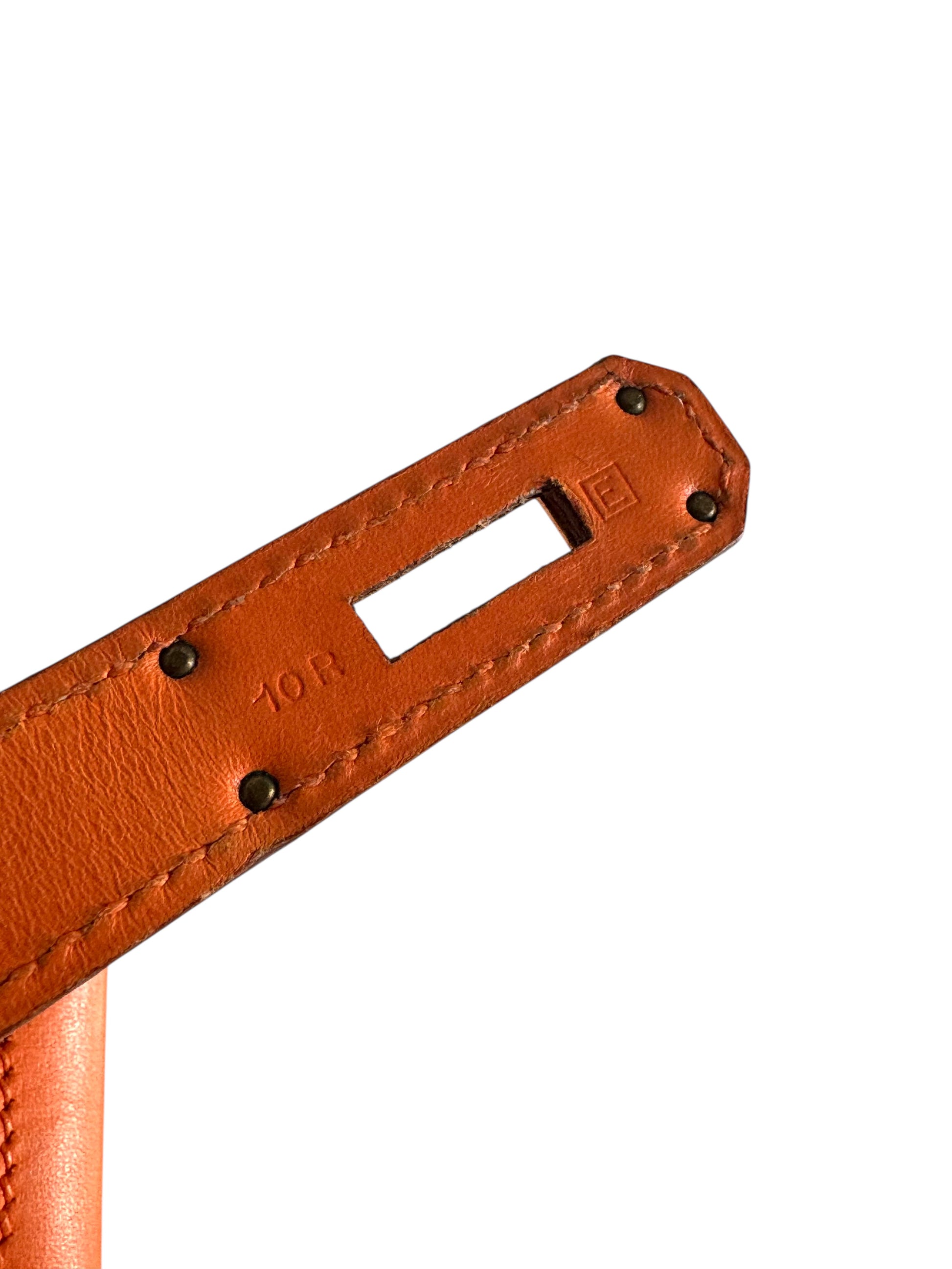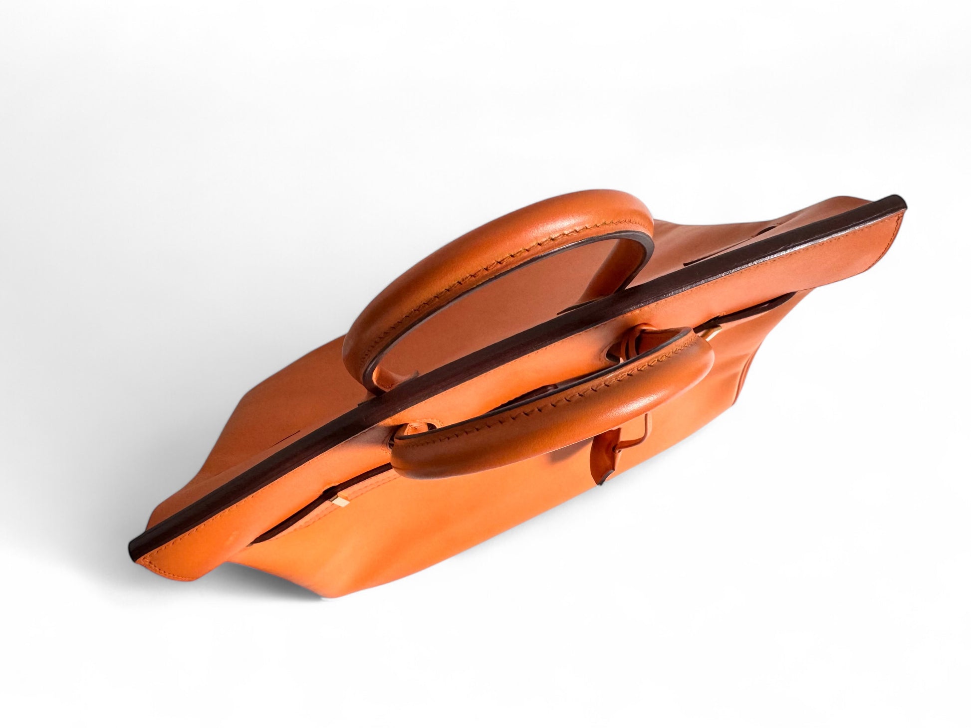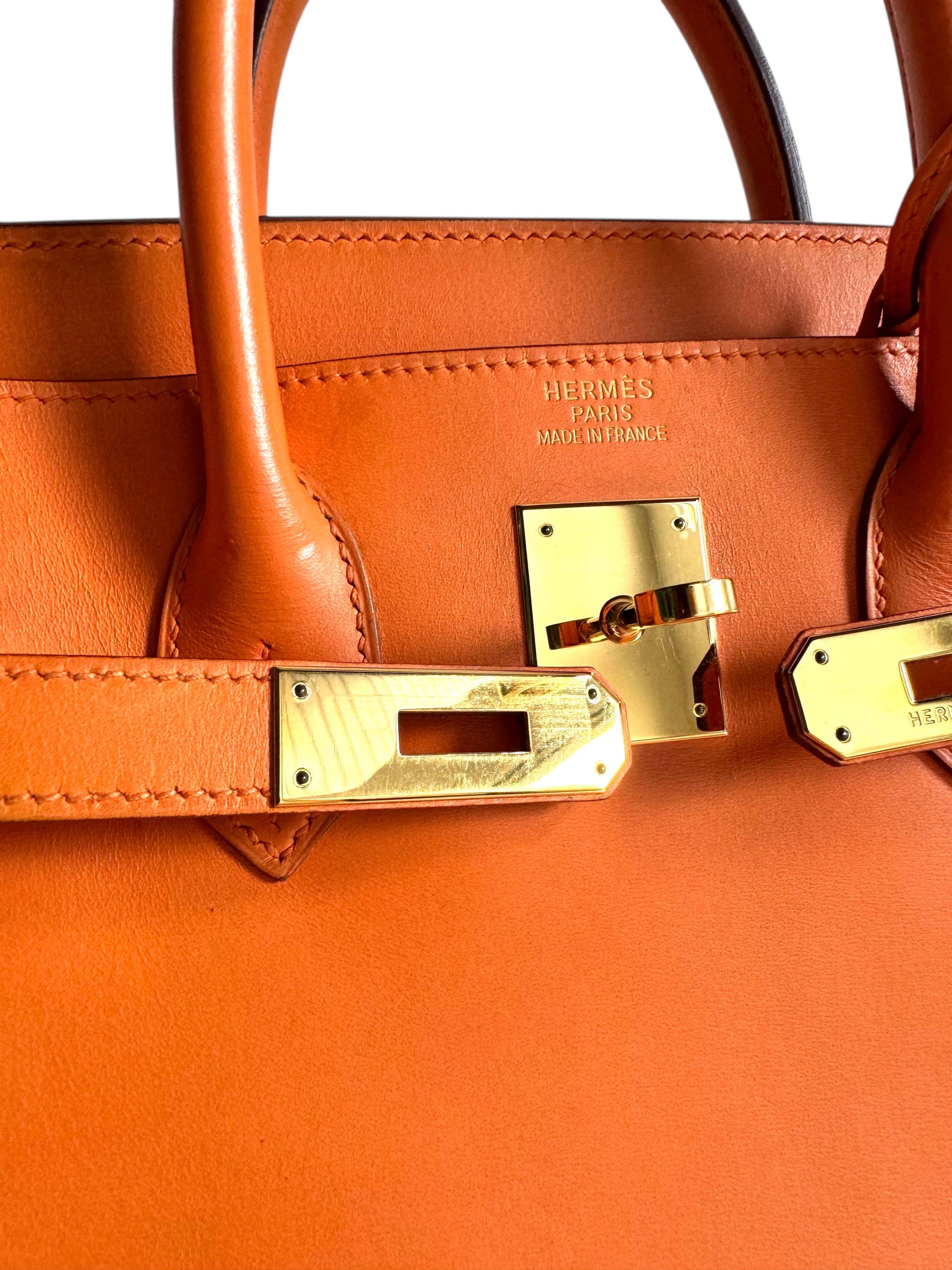 Description: This rare Hermès HAC 32 in Orange Box Calf is a true collector’s piece. Crafted in glossy calfskin with iconic rolled handles, it features the signature flap and gold-plated turn-lock with padlock. A spacious interior makes it the perfect blend of elegance and function — a timeless Hermès classic.
