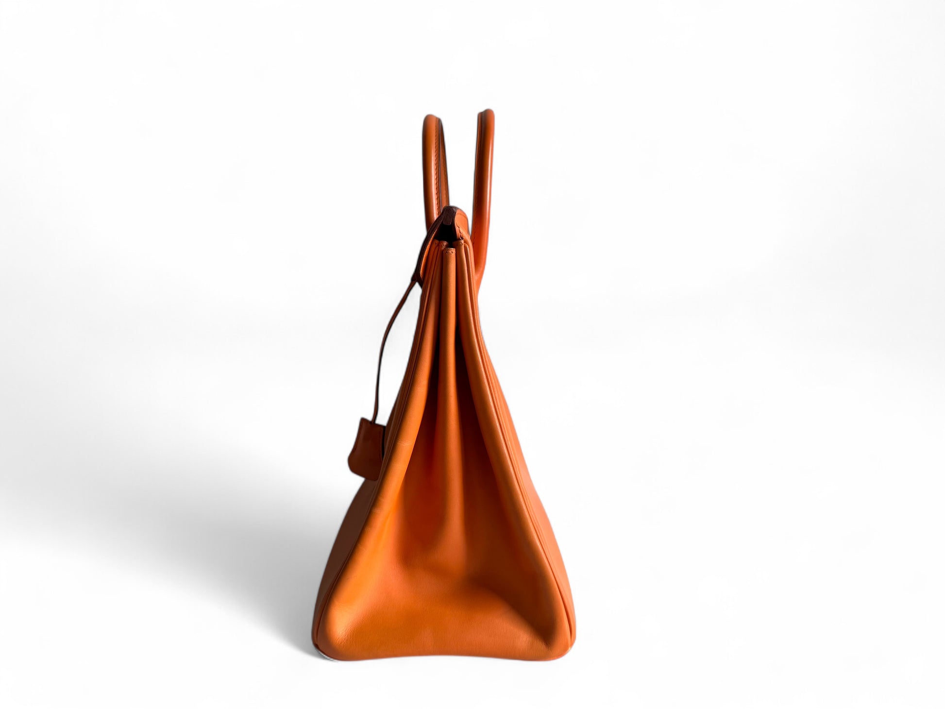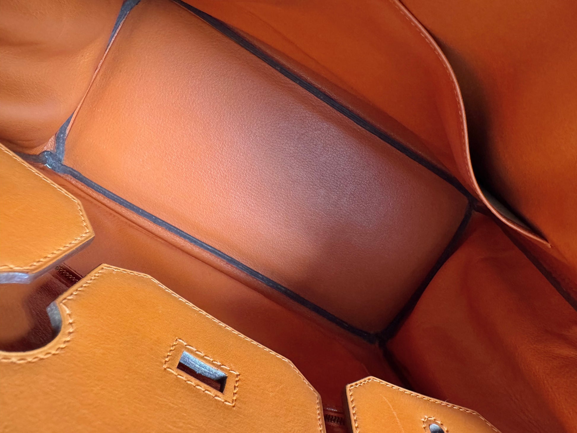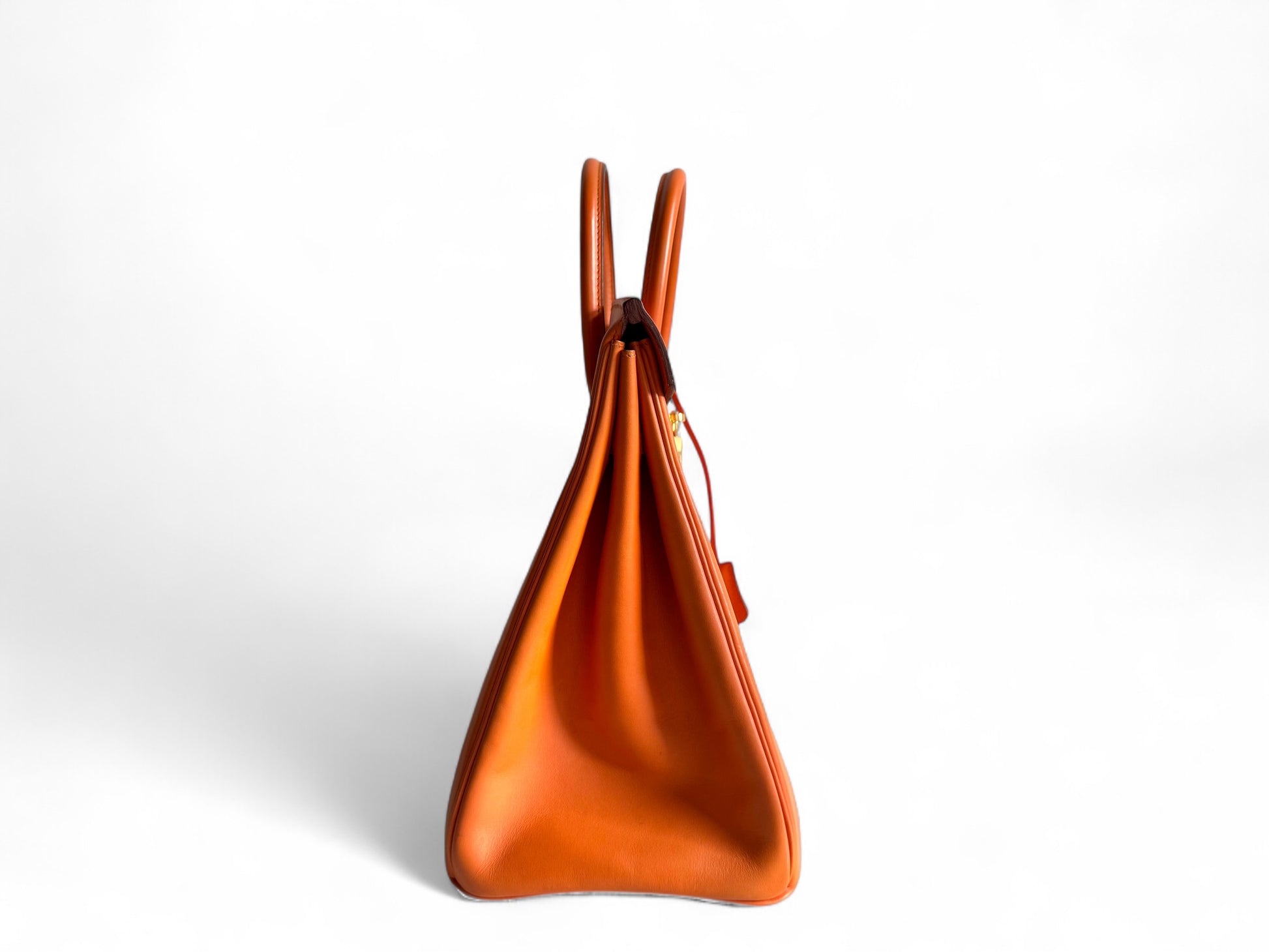 Description: This rare Hermès HAC 32 in Orange Box Calf is a true collector’s piece. Crafted in glossy calfskin with iconic rolled handles, it features the signature flap and gold-plated turn-lock with padlock. A spacious interior makes it the perfect blend of elegance and function — a timeless Hermès classic.
