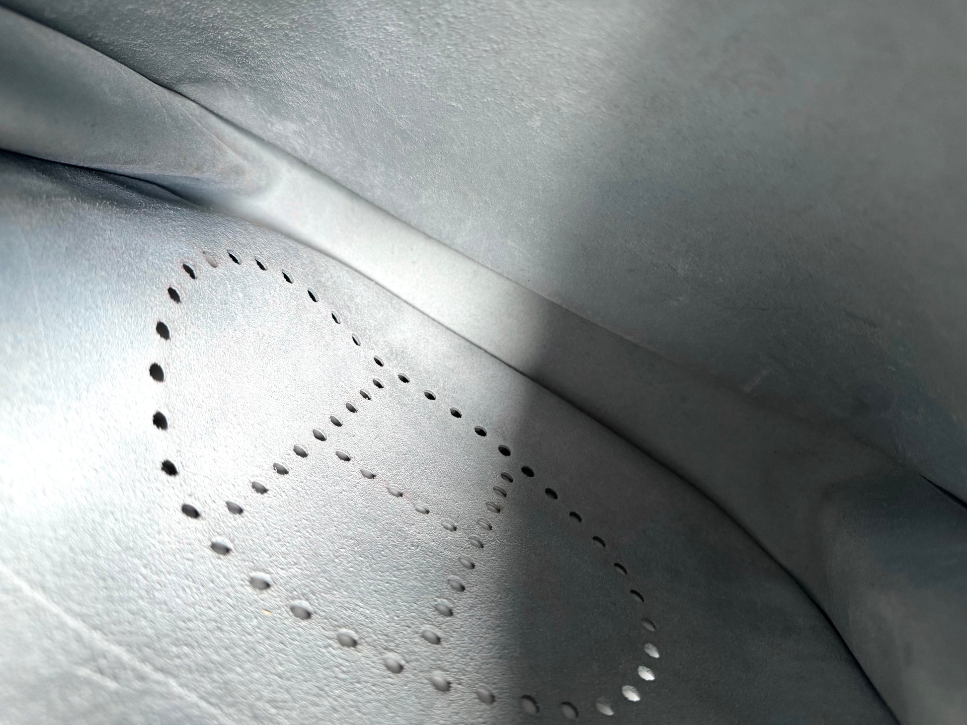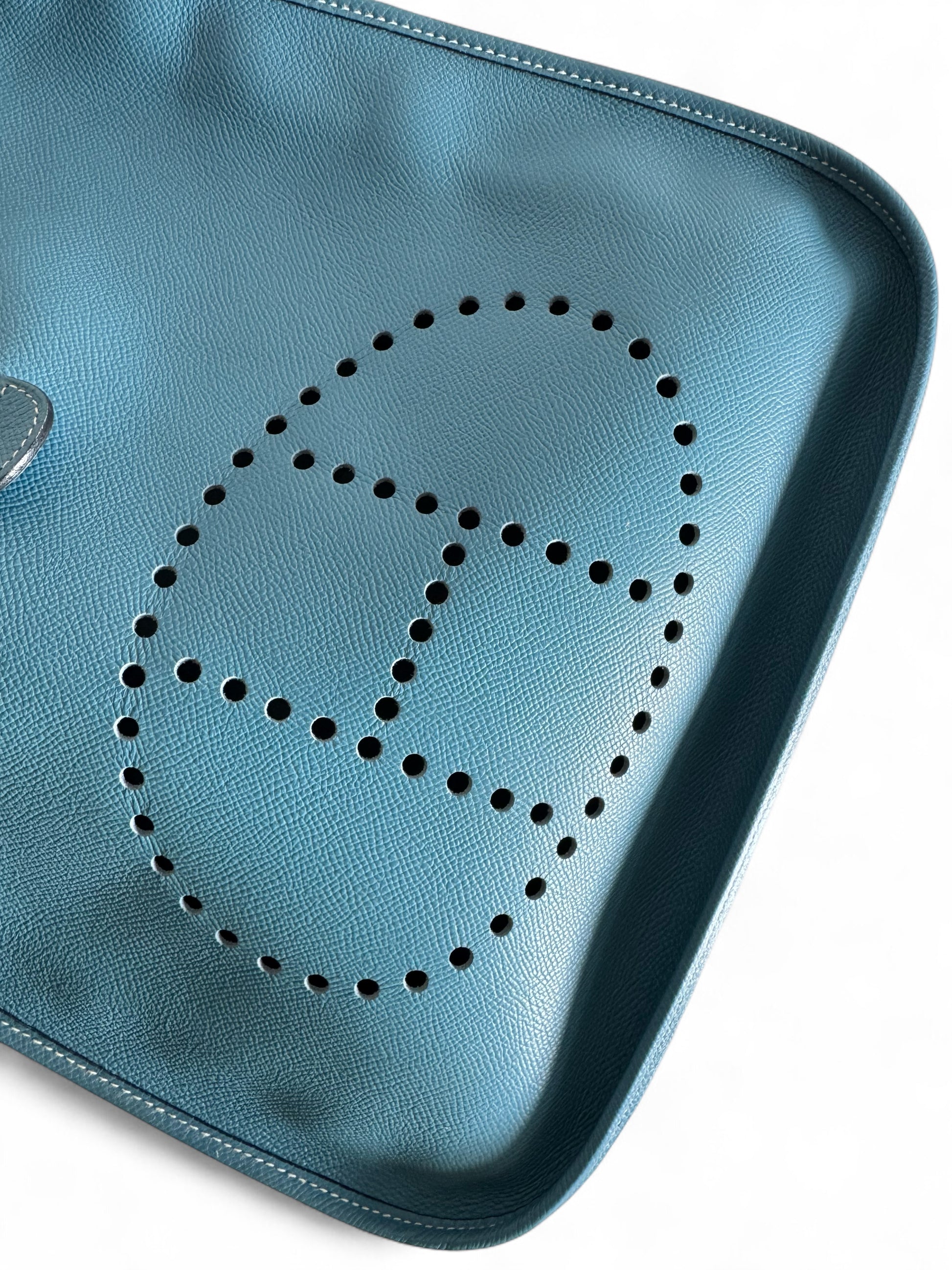 Description: This is an authentic HERMÈS Evelyne GM in Blue Jean Courchevel leather. This elegant crossbody bag is beautifully crafted from calfskin in a light blue tone. It showcases a signature perforated H logo. The snap closure opens to reveal a soft suede-lined interior, combining timeless style with everyday functionality.