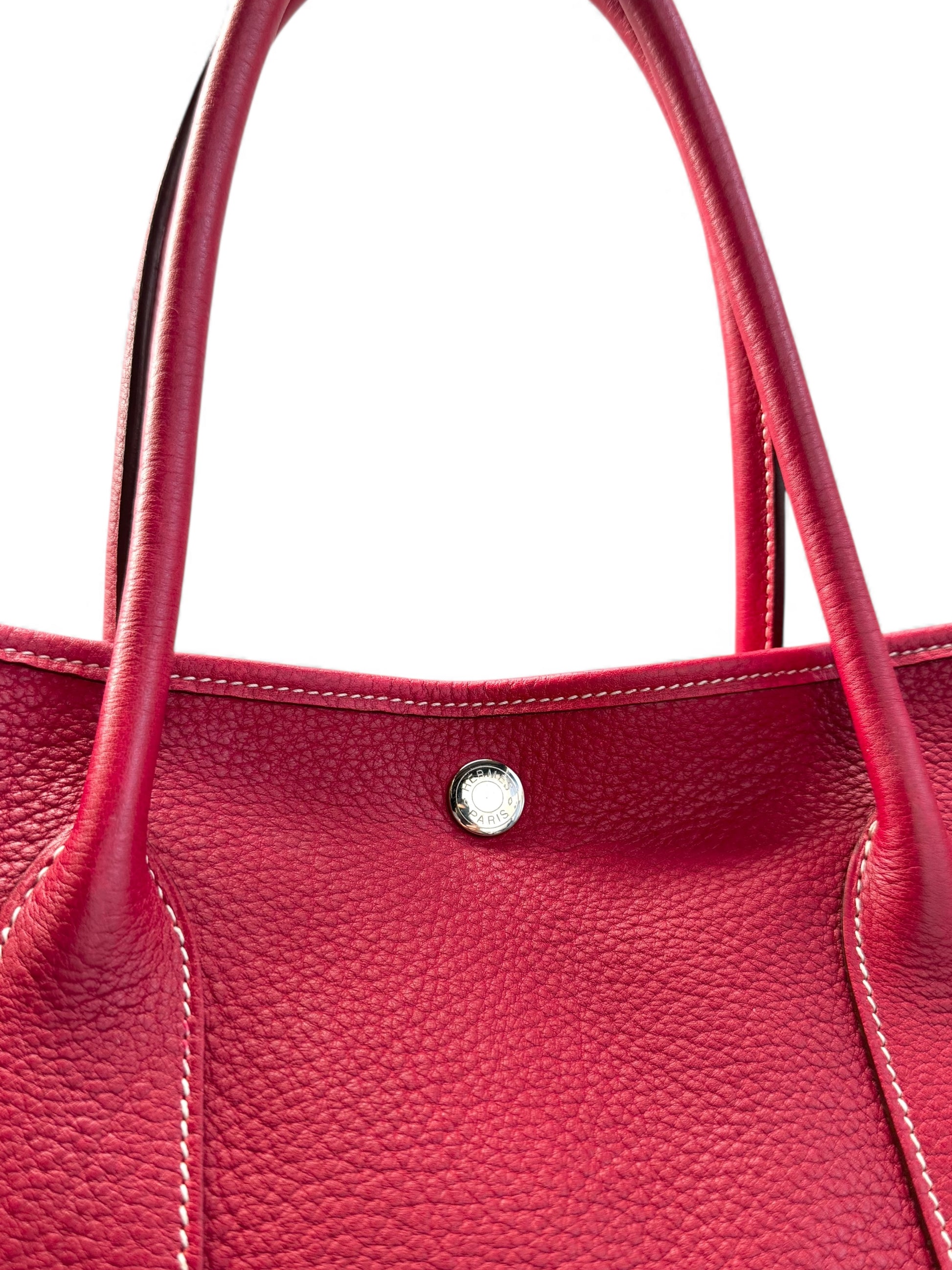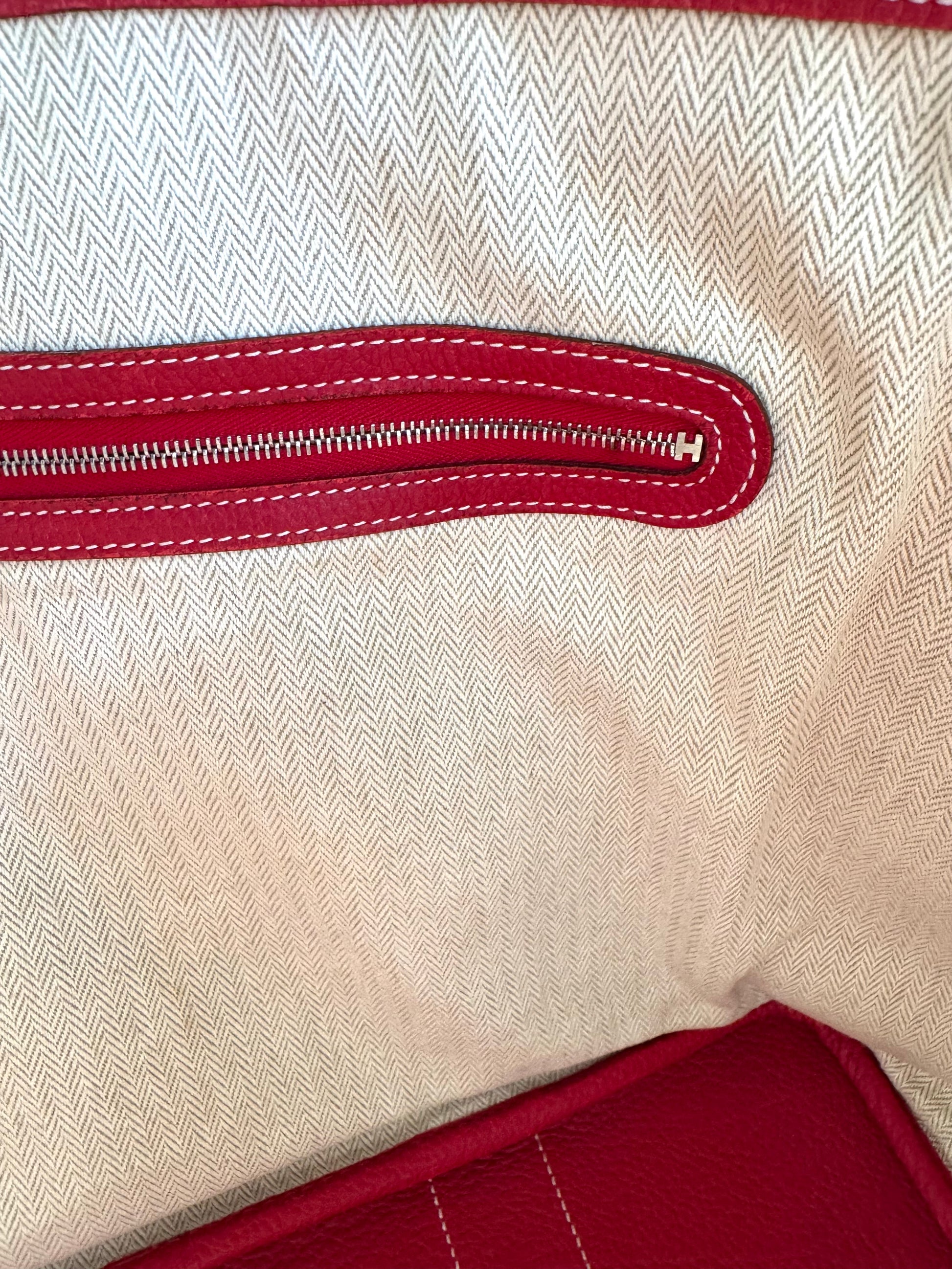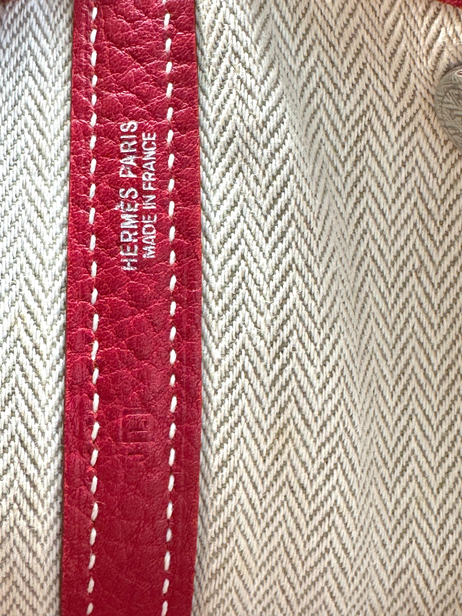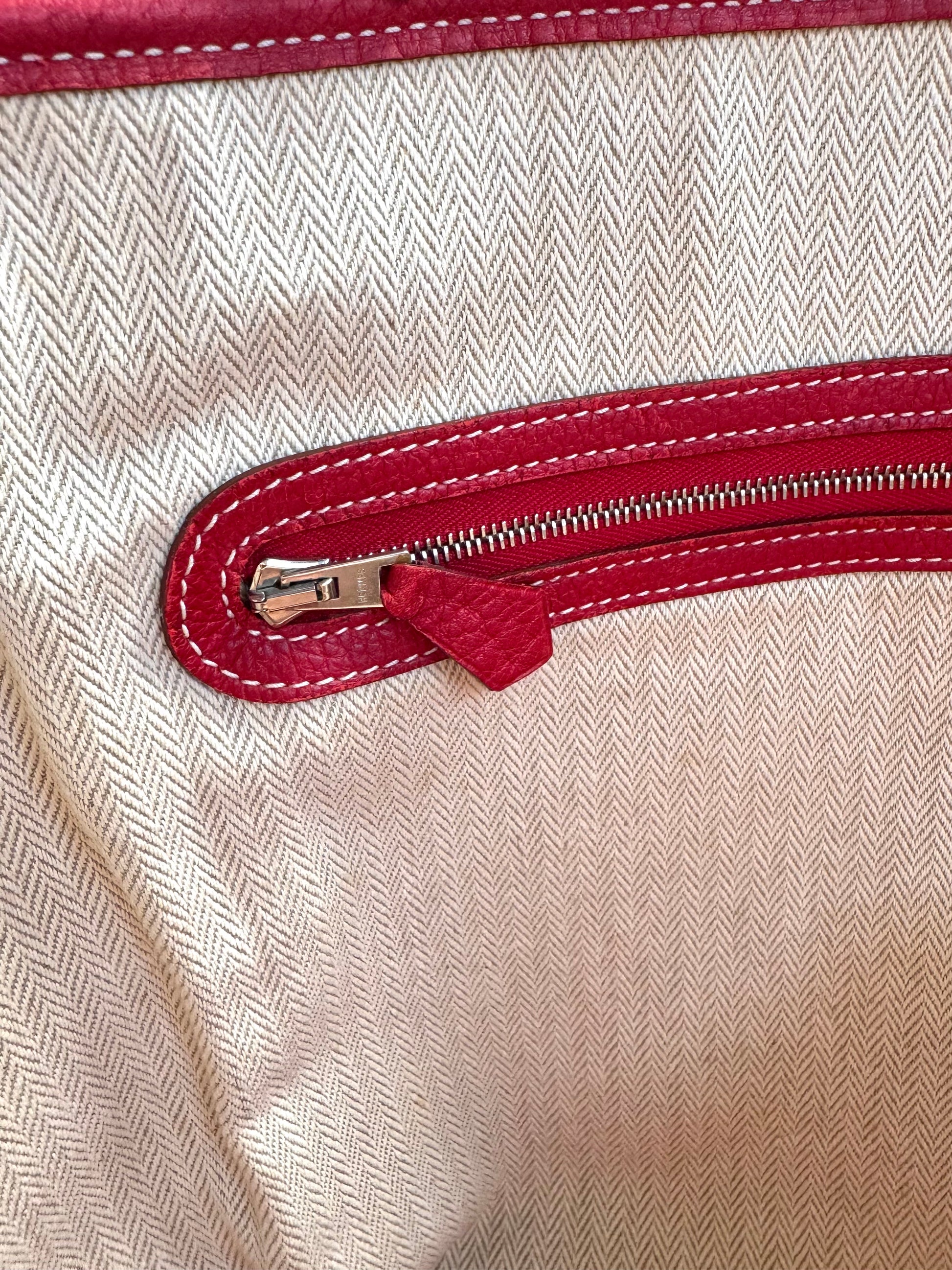 Description: This is an authentic HERMÈS Negonda Garden Party 36 in Rouge Casaque. This elegant tote is crafted from richly textured red calfskin. It features expandable side panels and matching leather accents that form the rolled top handles. The top can be unsnapped to reveal a roomy interior lined with herringbone fabric and equipped with a large zip pocket for added convenience.