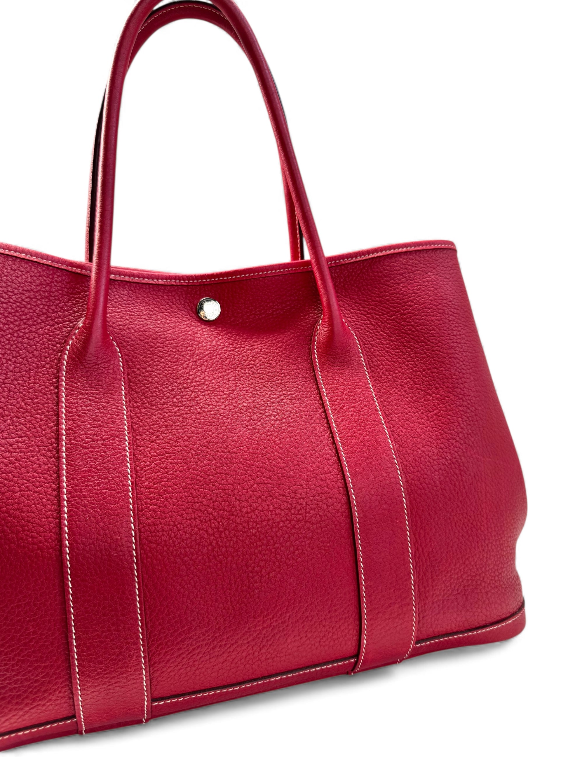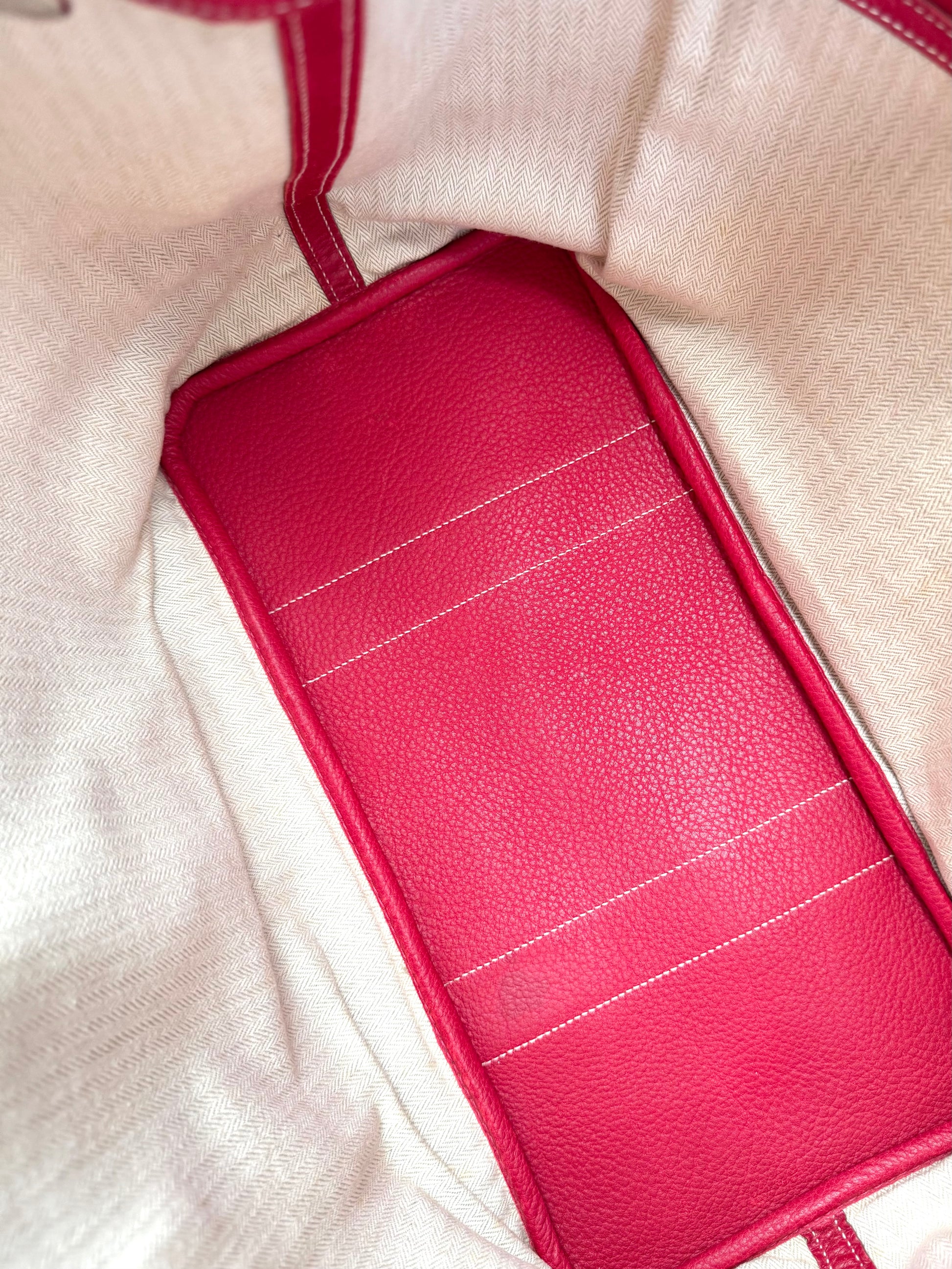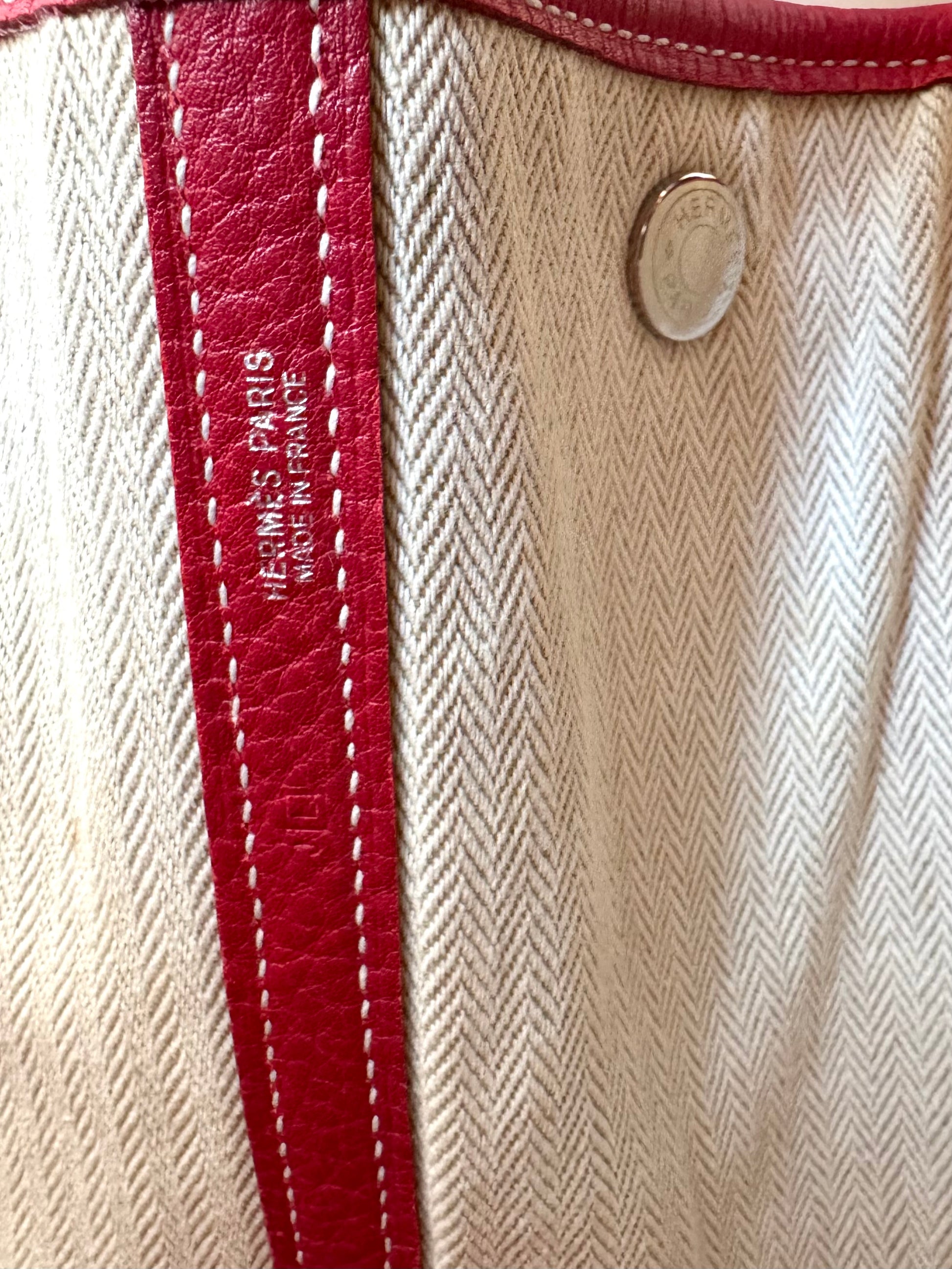 Description: This is an authentic HERMÈS Negonda Garden Party 36 in Rouge Casaque. This elegant tote is crafted from richly textured red calfskin. It features expandable side panels and matching leather accents that form the rolled top handles. The top can be unsnapped to reveal a roomy interior lined with herringbone fabric and equipped with a large zip pocket for added convenience.