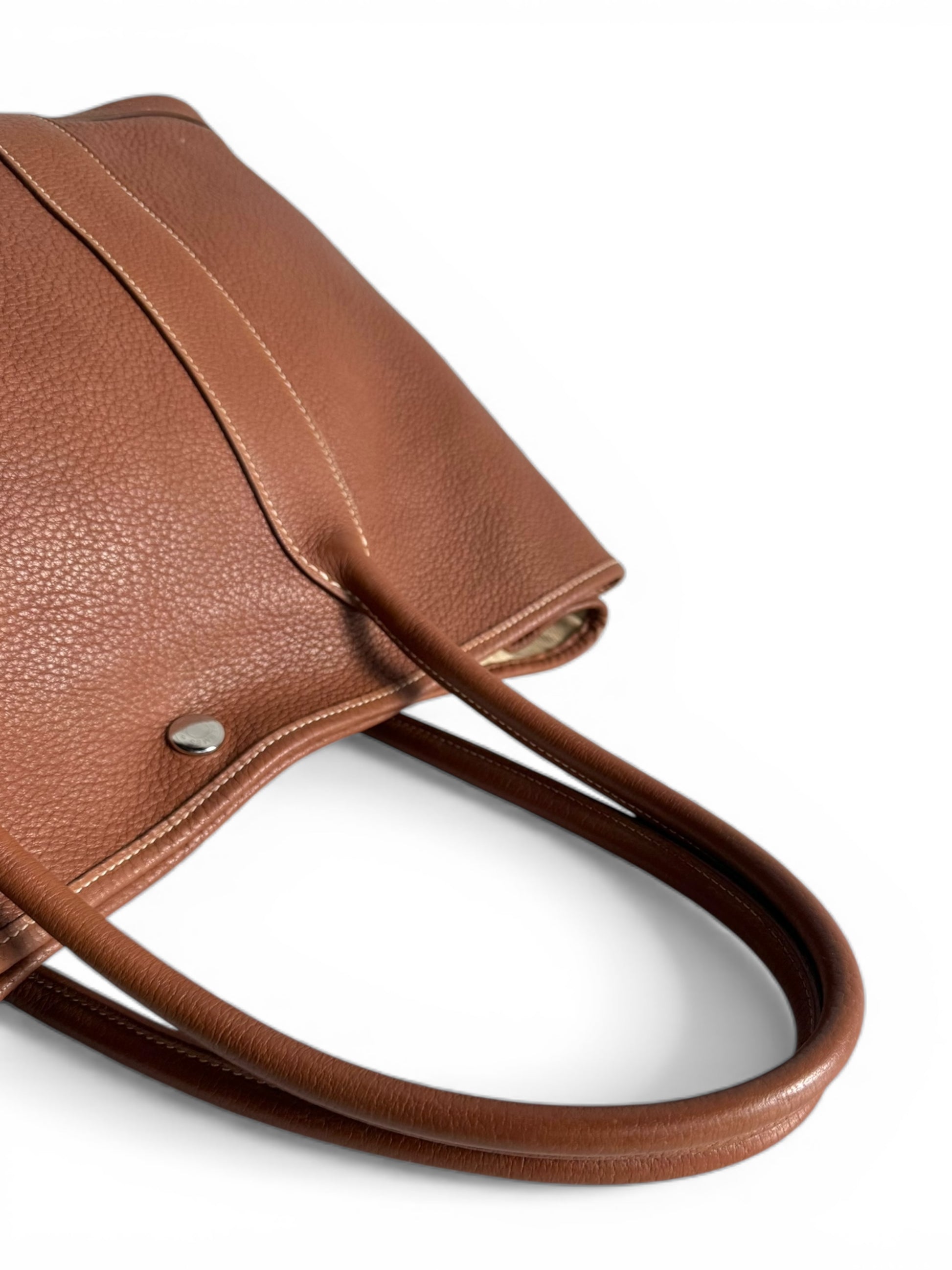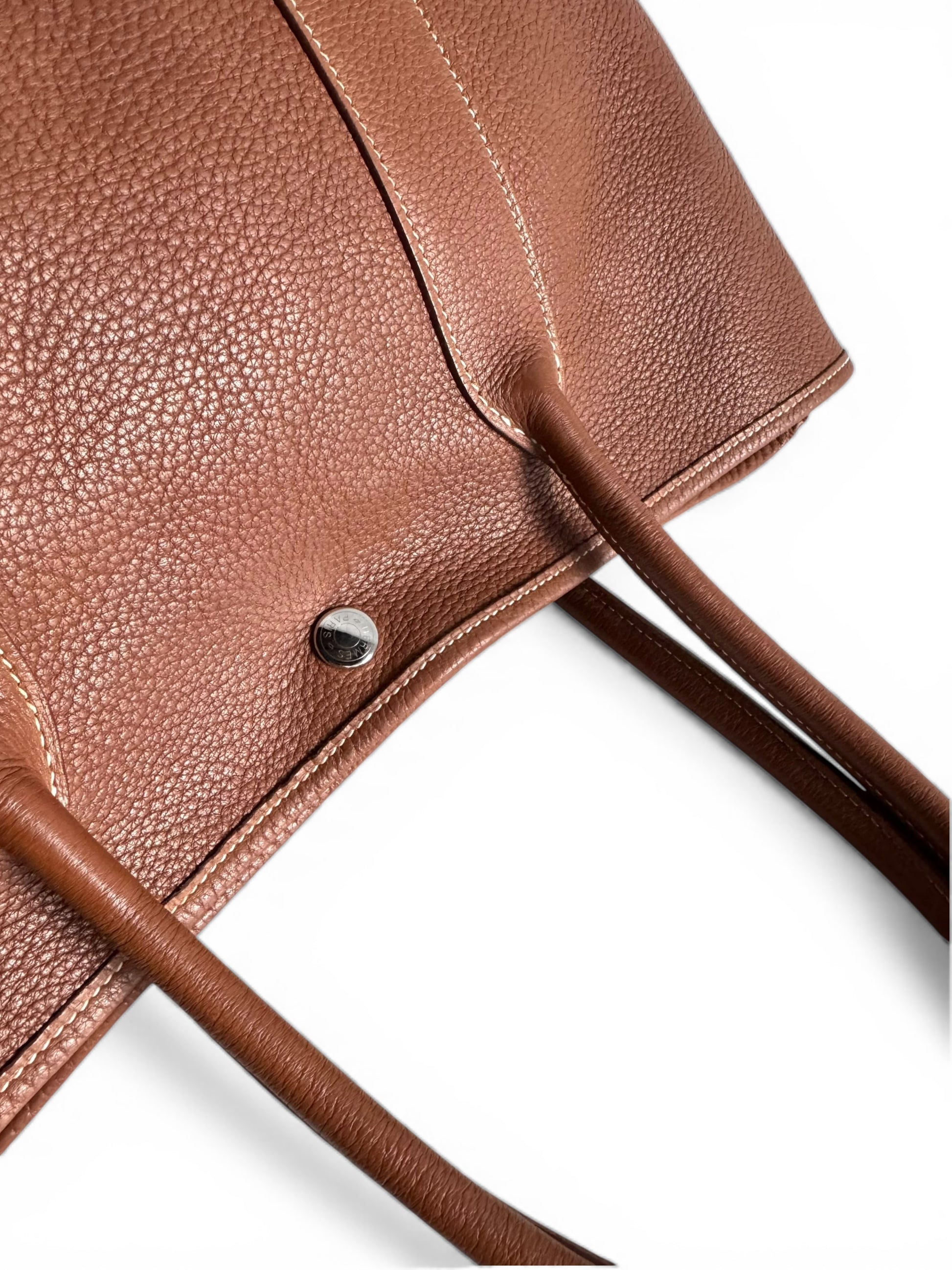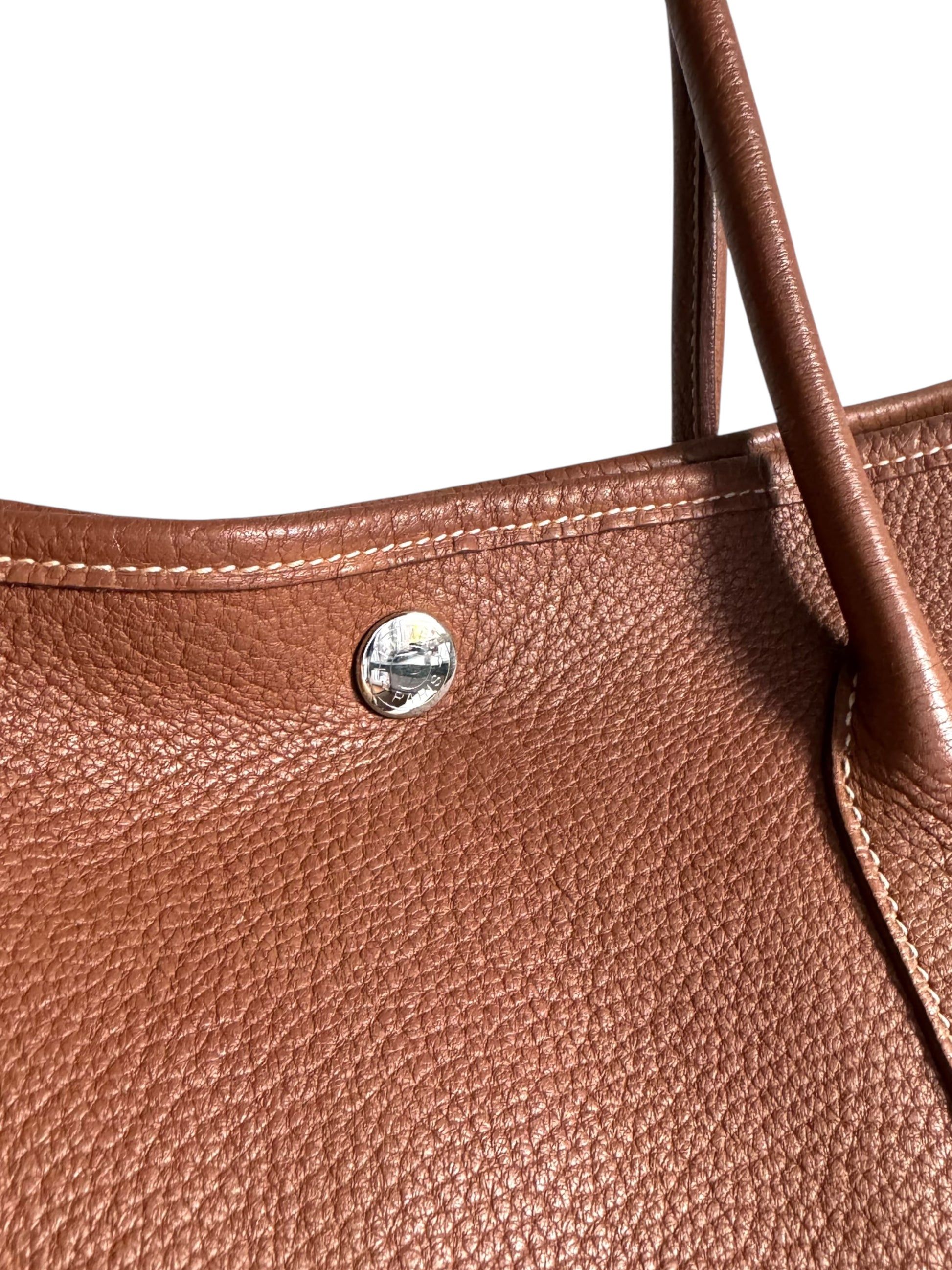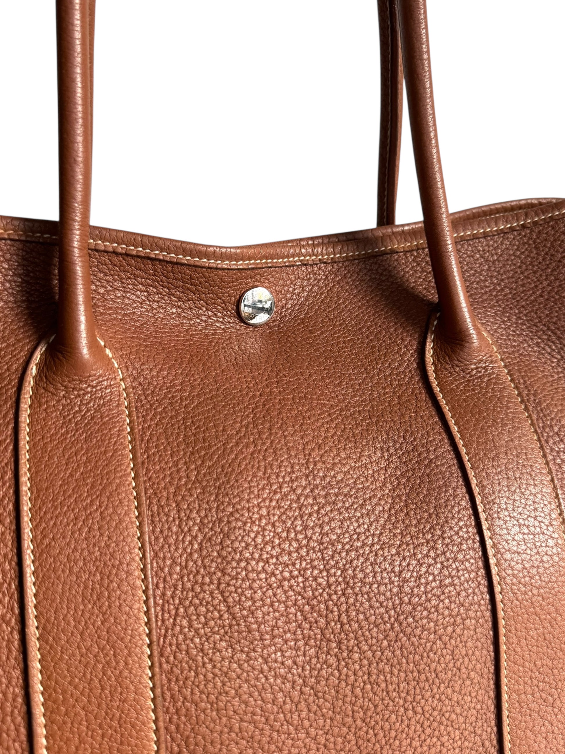 Description: This is an authentic HERMÈS Negonda Garden Party 36 in Gold. This refined tote is made from premium golden-brown leather, accented with white contrast stitching. It boasts expandable side panels secured with snaps, smooth leather trim that flows into rolled top handles, and a palladium-silver snap closure. Inside, the bag opens to a roomy ivory fabric interior with a convenient zippered pocket.