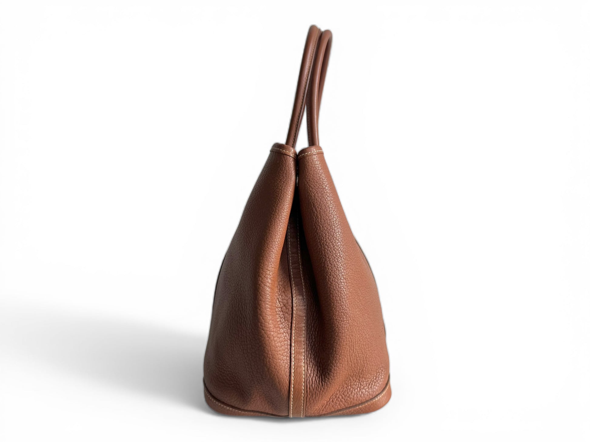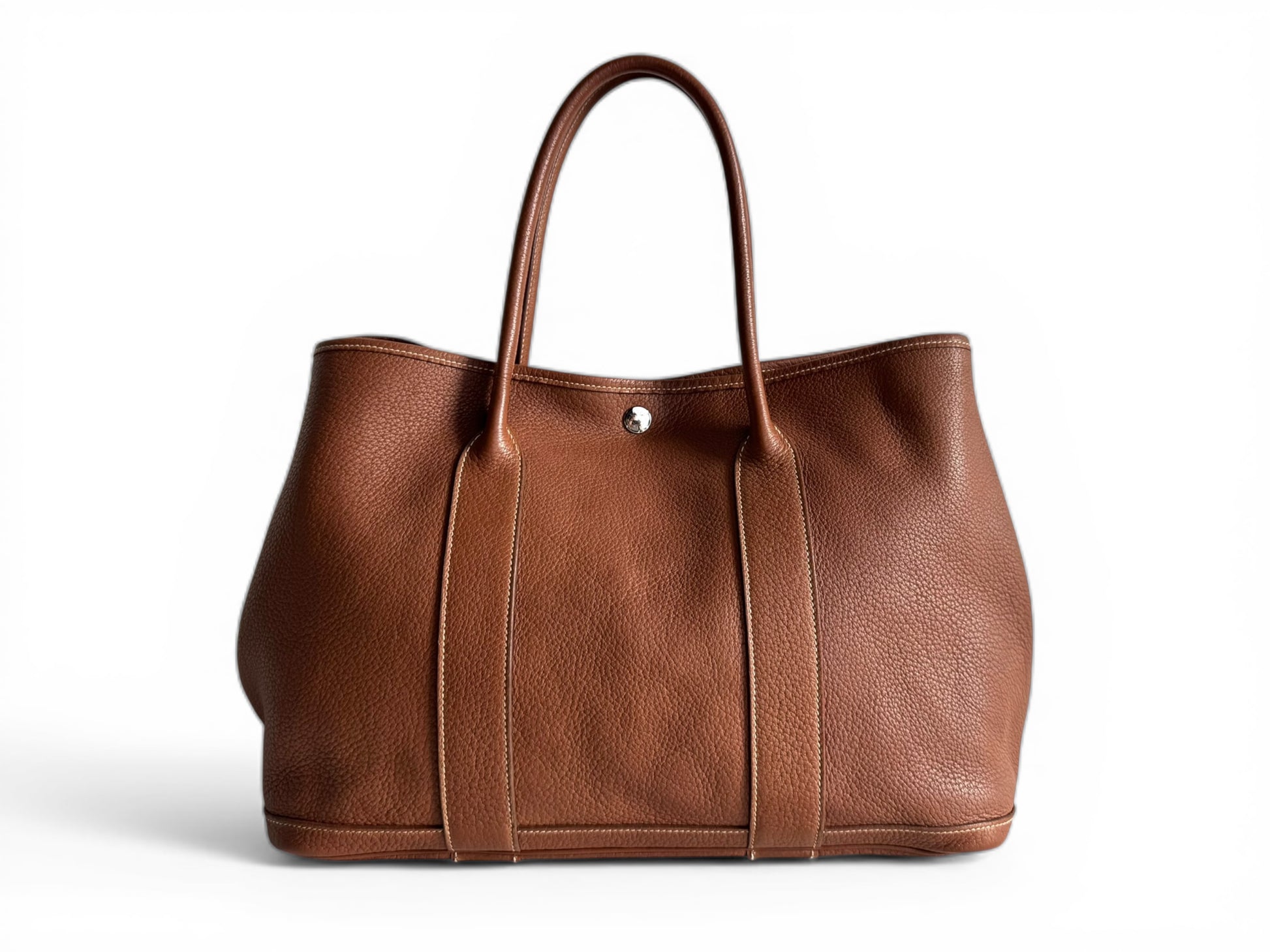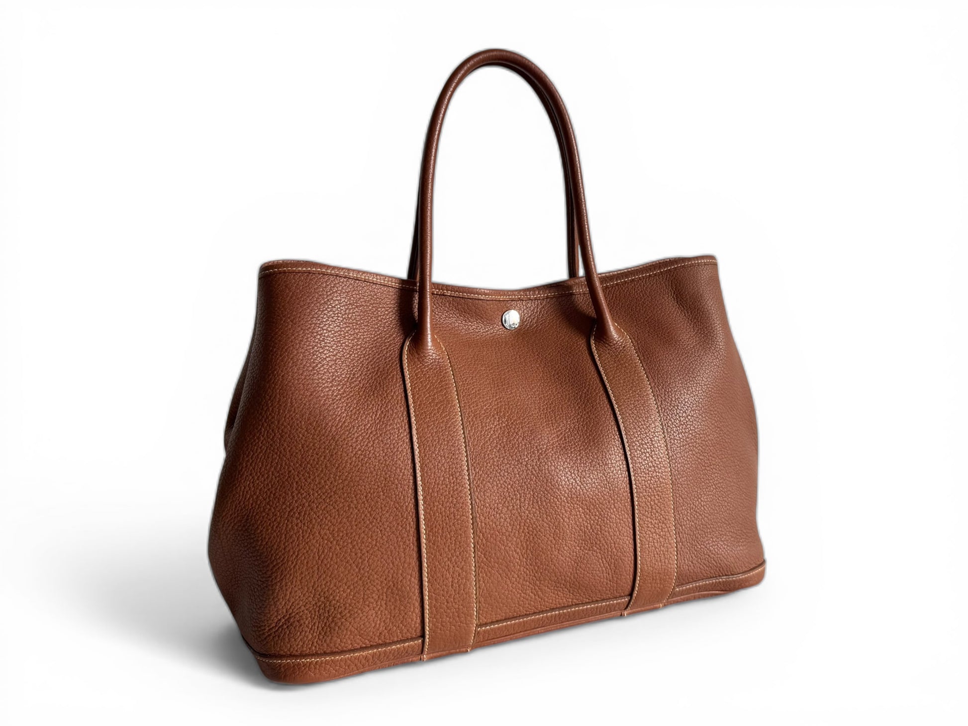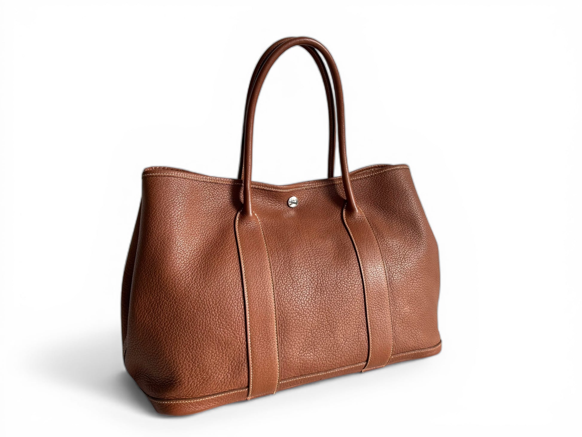 Description: This is an authentic HERMÈS Negonda Garden Party 36 in Gold. This refined tote is made from premium golden-brown leather, accented with white contrast stitching. It boasts expandable side panels secured with snaps, smooth leather trim that flows into rolled top handles, and a palladium-silver snap closure. Inside, the bag opens to a roomy ivory fabric interior with a convenient zippered pocket.
