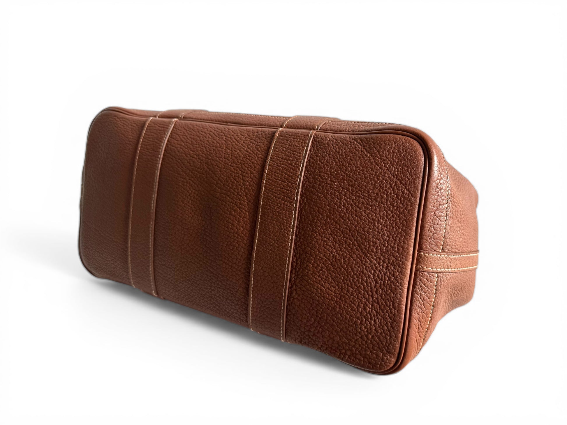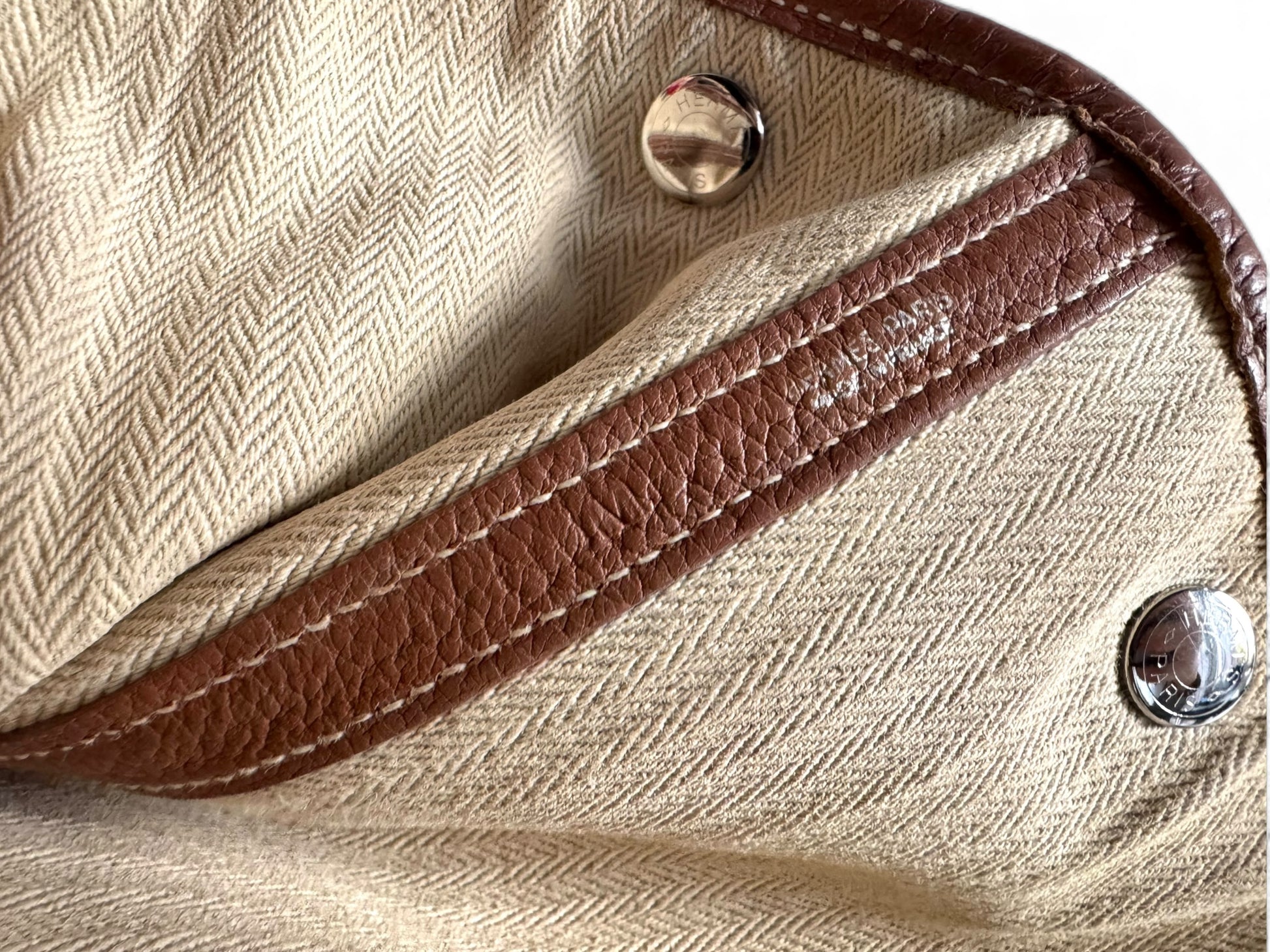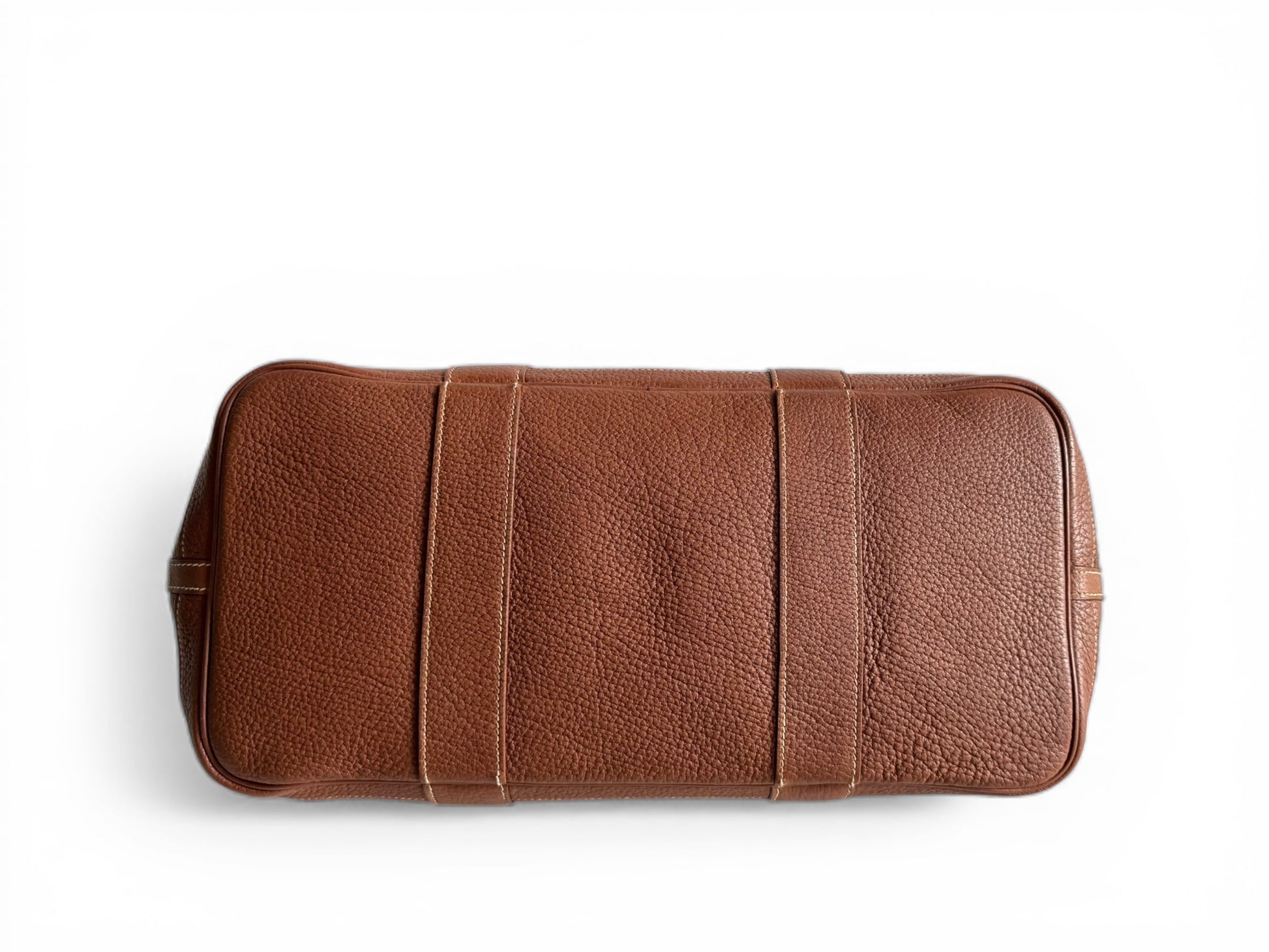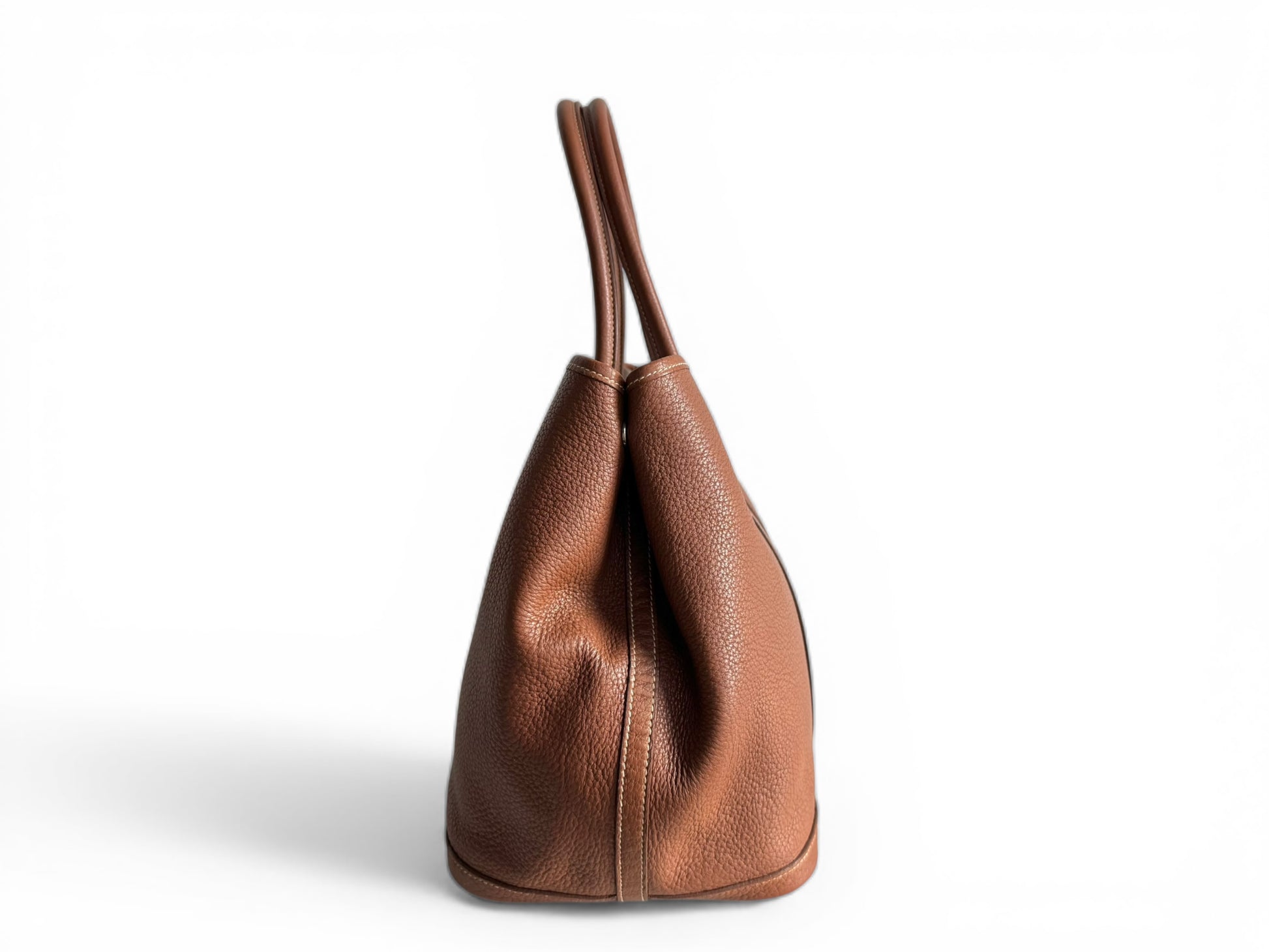 Description: This is an authentic HERMÈS Negonda Garden Party 36 in Gold. This refined tote is made from premium golden-brown leather, accented with white contrast stitching. It boasts expandable side panels secured with snaps, smooth leather trim that flows into rolled top handles, and a palladium-silver snap closure. Inside, the bag opens to a roomy ivory fabric interior with a convenient zippered pocket.