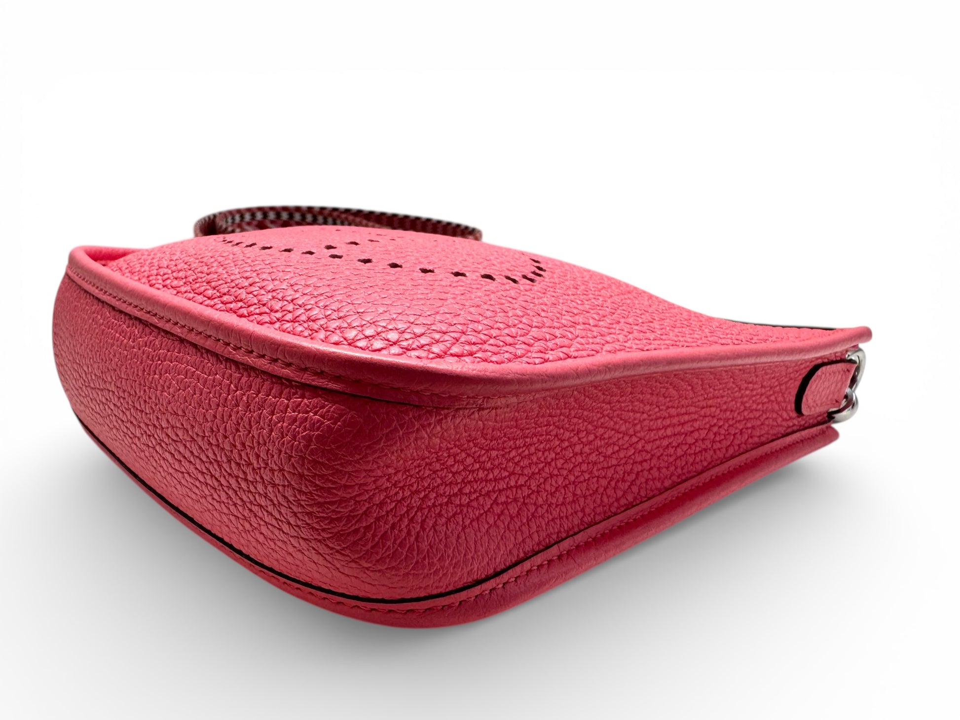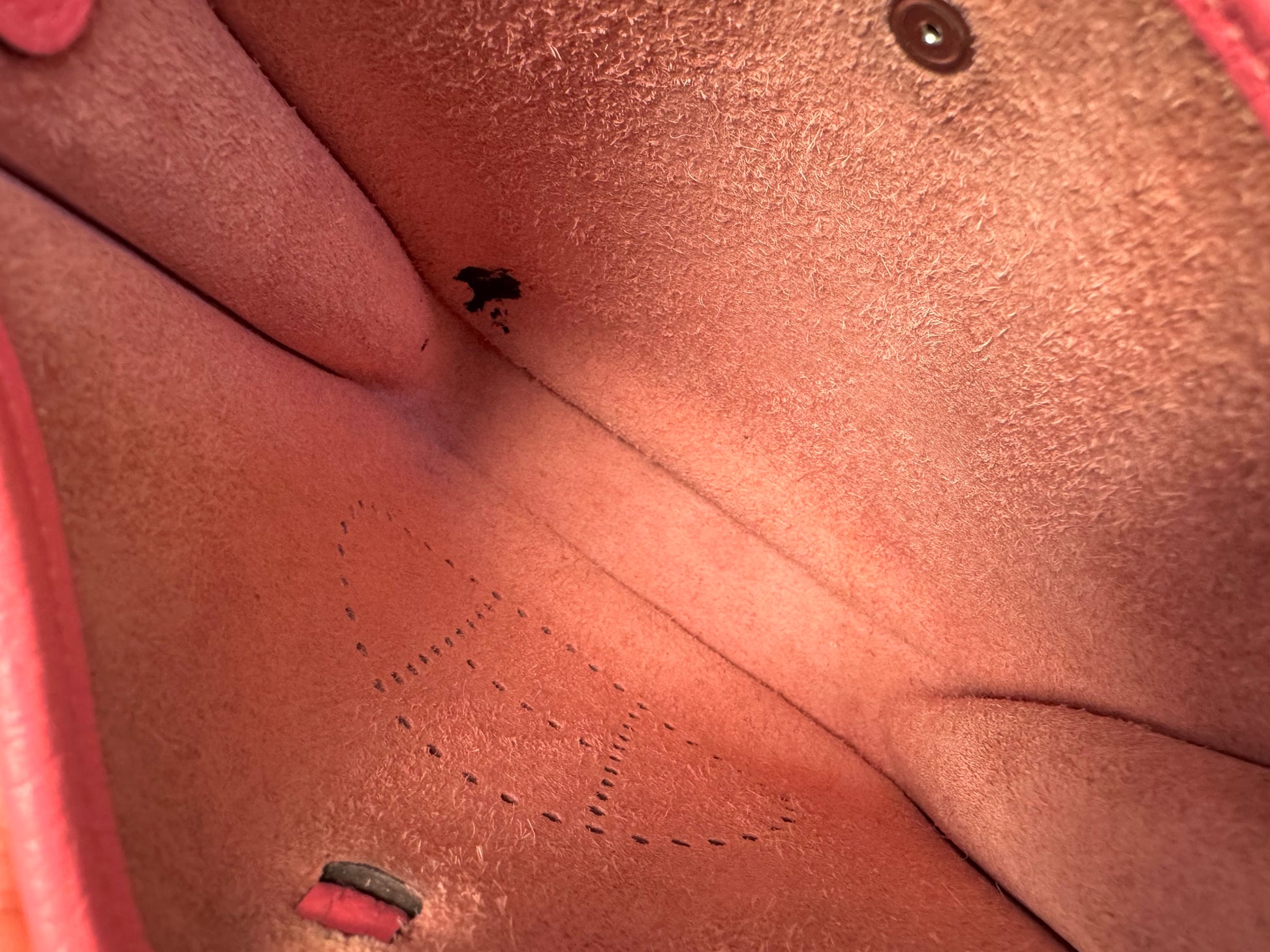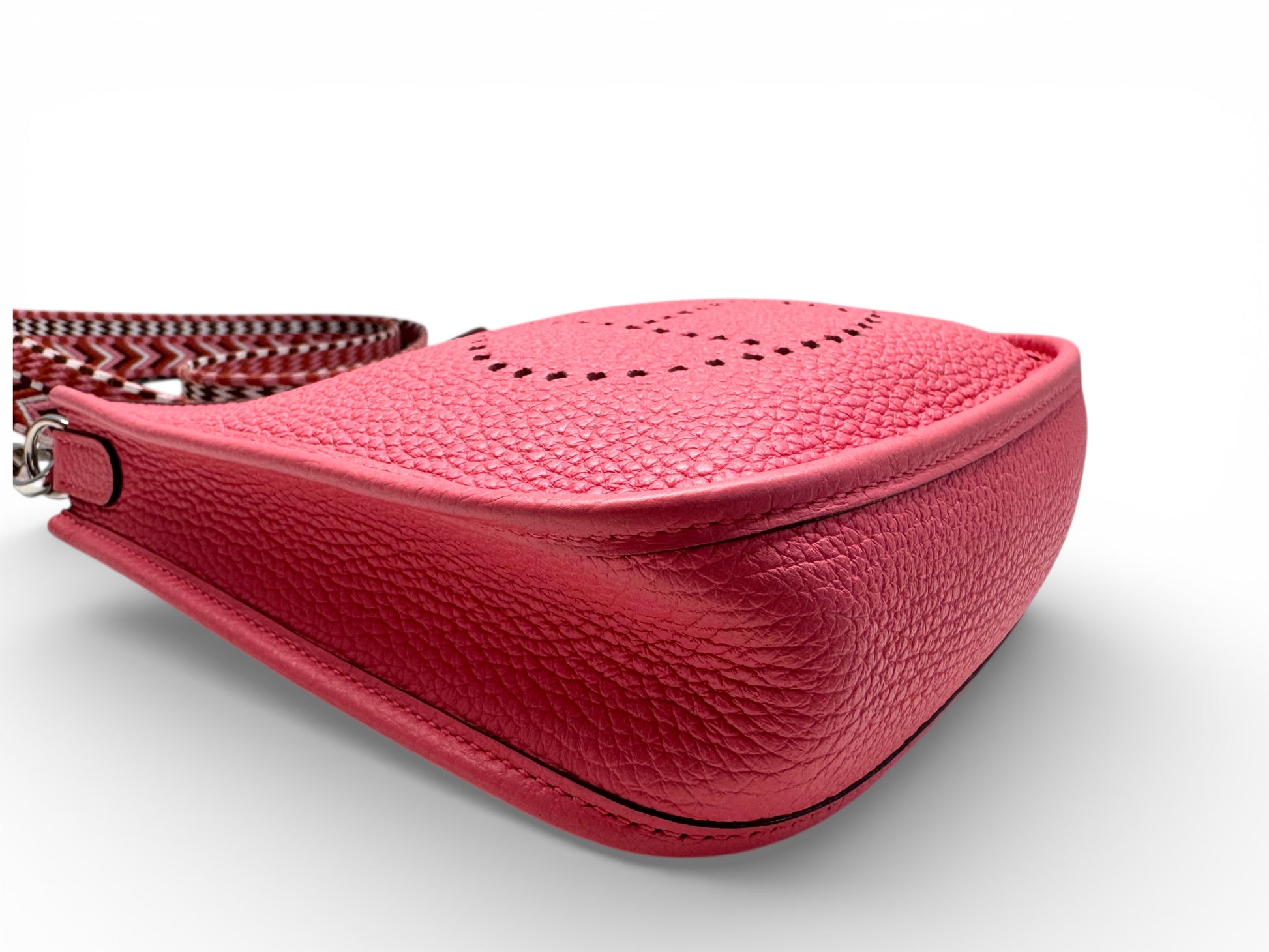 Description: This authentic Hermès Evelyne TPM Allegro is crafted from supple Taurillon Clemence calfskin in the delicate shades of Rose Azalée and Rose Confetti. Designed in a compact messenger style, the bag features a signature perforated Hermès “H” on the front, complemented by palladium-plated hardware. A patterned canvas shoulder strap adds a relaxed yet refined touch, while the crossover leather tab secures the opening. The interior is finished in soft suede, offering both elegance and practicality.