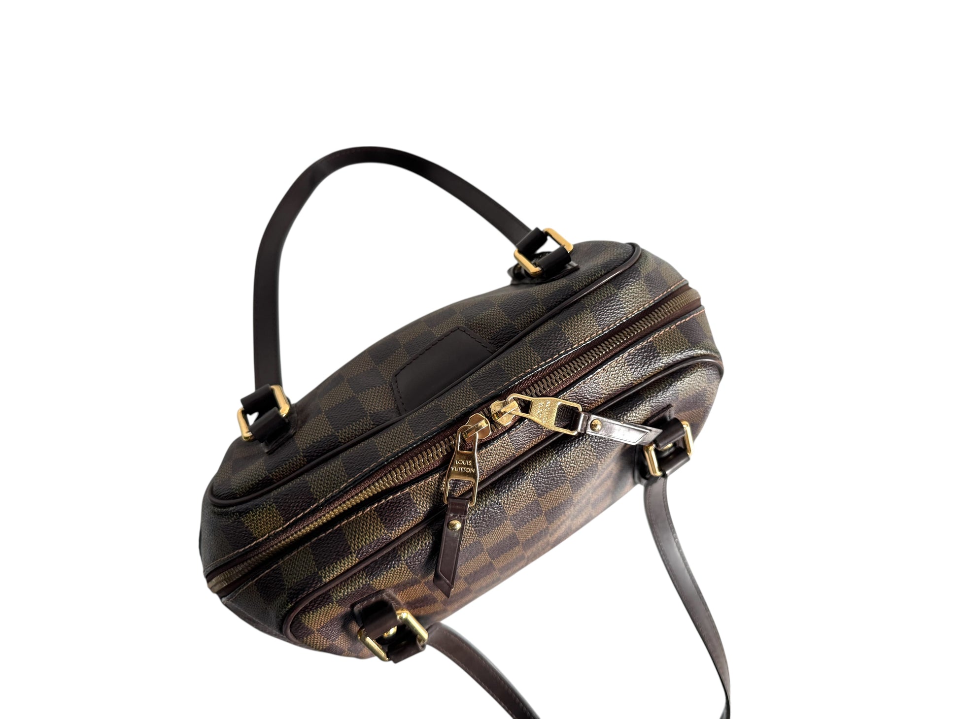 Description: This is an authentic LOUIS VUITTON Damier Ebene Rivington PM. This distinctive shoulder bag is crafted with Damier Ebene checkered patterned coated canvas. It features brown leather strap handles, trim and brass links. The top zipper opens to a red fabric interior with a hanging patch pocket