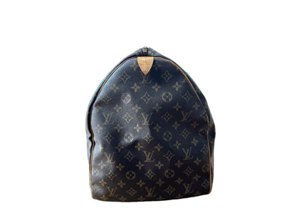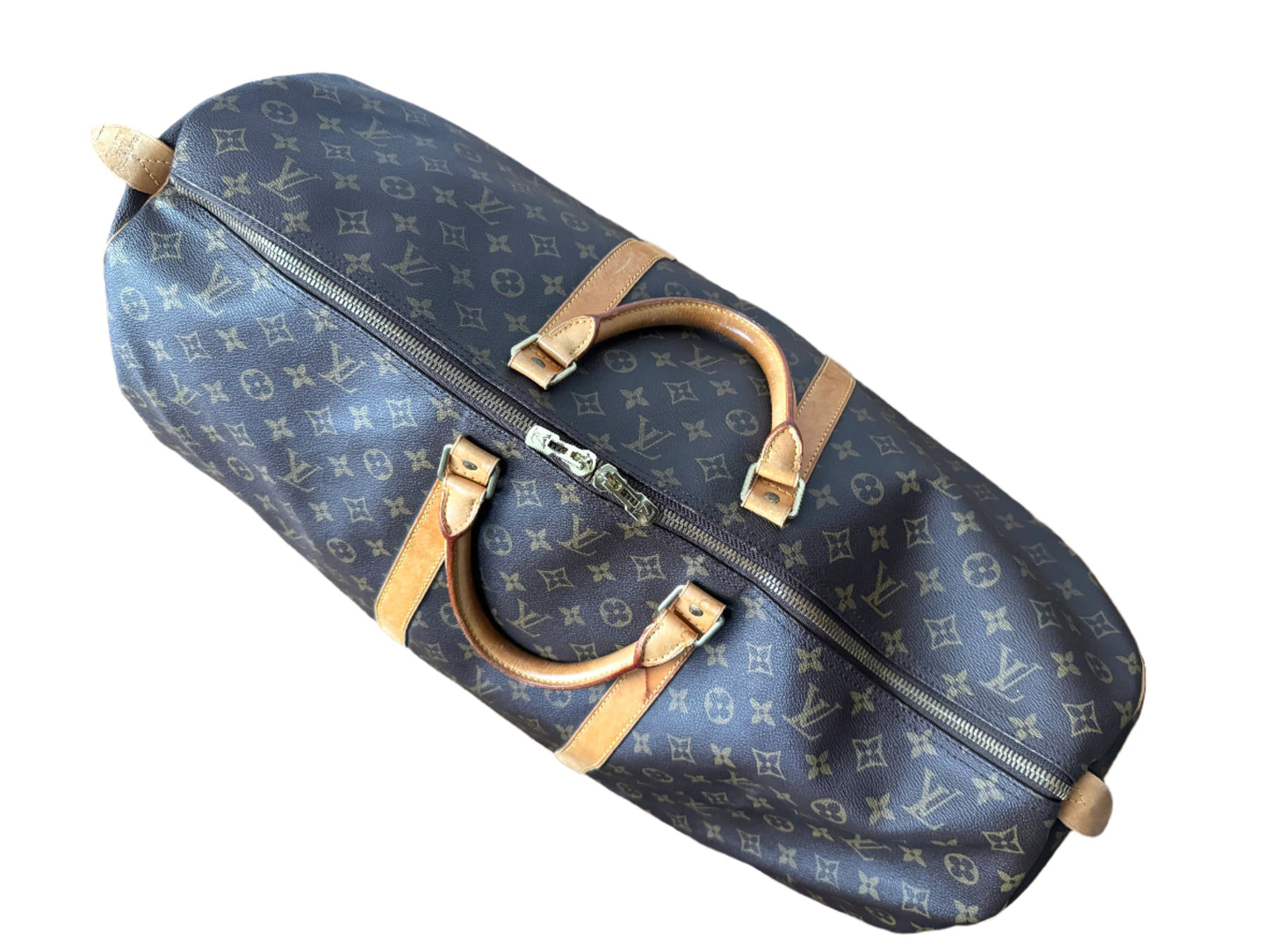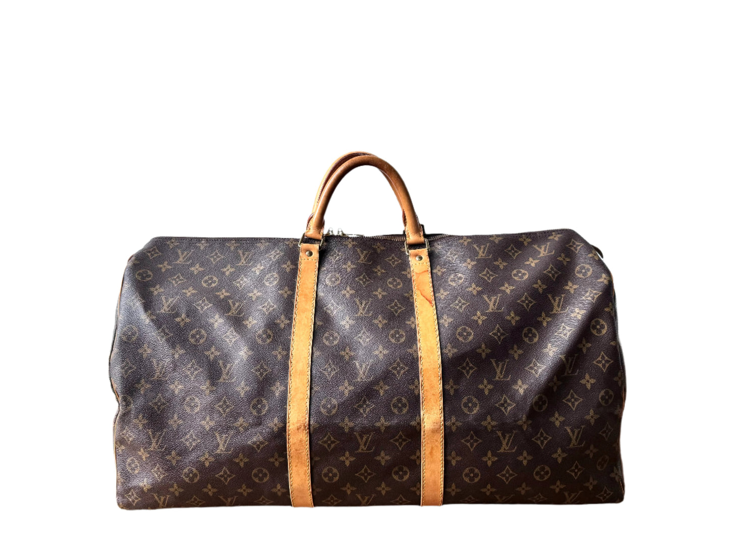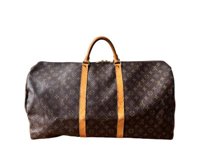 Description: This is an authentic LOUIS VUITTON Monogram Keepall 60. This stylish bag is crafted of signature Louis Vuitton monogram on toile canvas. The bag features vachetta cowhide leather trim and rolled top handles with coated brass hardware. The top zippers open the bag to a spacious cocoa brown fabric interior.