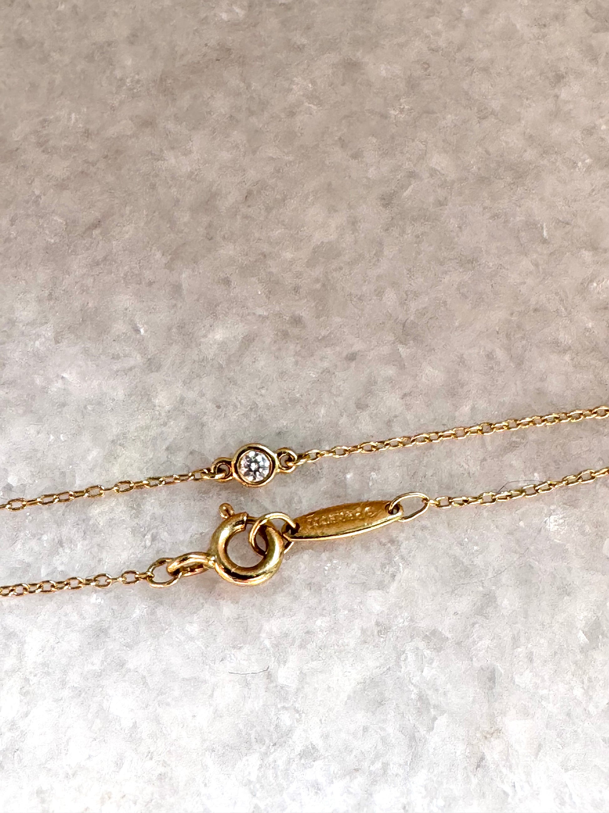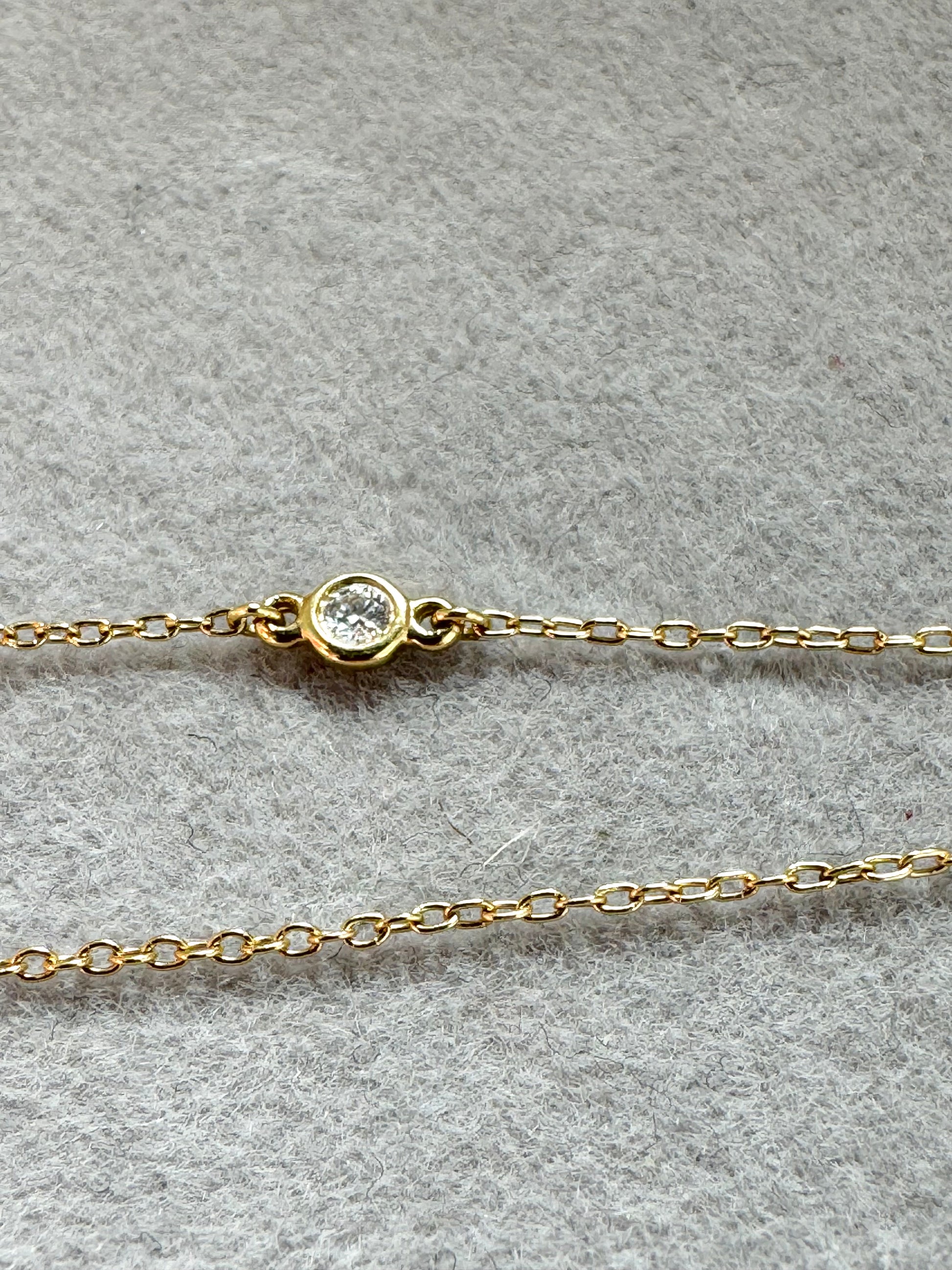 Description: This authentic TIFFANY & CO. Elsa Peretti “Diamonds by the Yard” bracelet is finely crafted in 18K yellow gold, showcasing a single brilliant-cut diamond in a delicate bezel setting. A timeless and elegant piece that embodies understated luxury.