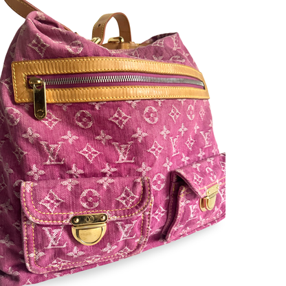 Description: This is a genuine LOUIS VUITTON Denim Baggy GM in Fuchsia. This chic shoulder bag is made from Louis Vuitton’s signature monogram denim in a striking fuchsia pink hue. It features a wide, adjustable vachetta leather shoulder strap with brass buckle details, a front zipper with vachetta trim, and two exterior pockets secured by brass push-lock closures. The top zipper closure opens to reveal a fuchsia microfiber-lined interior, complete with a convenient patch pocket.